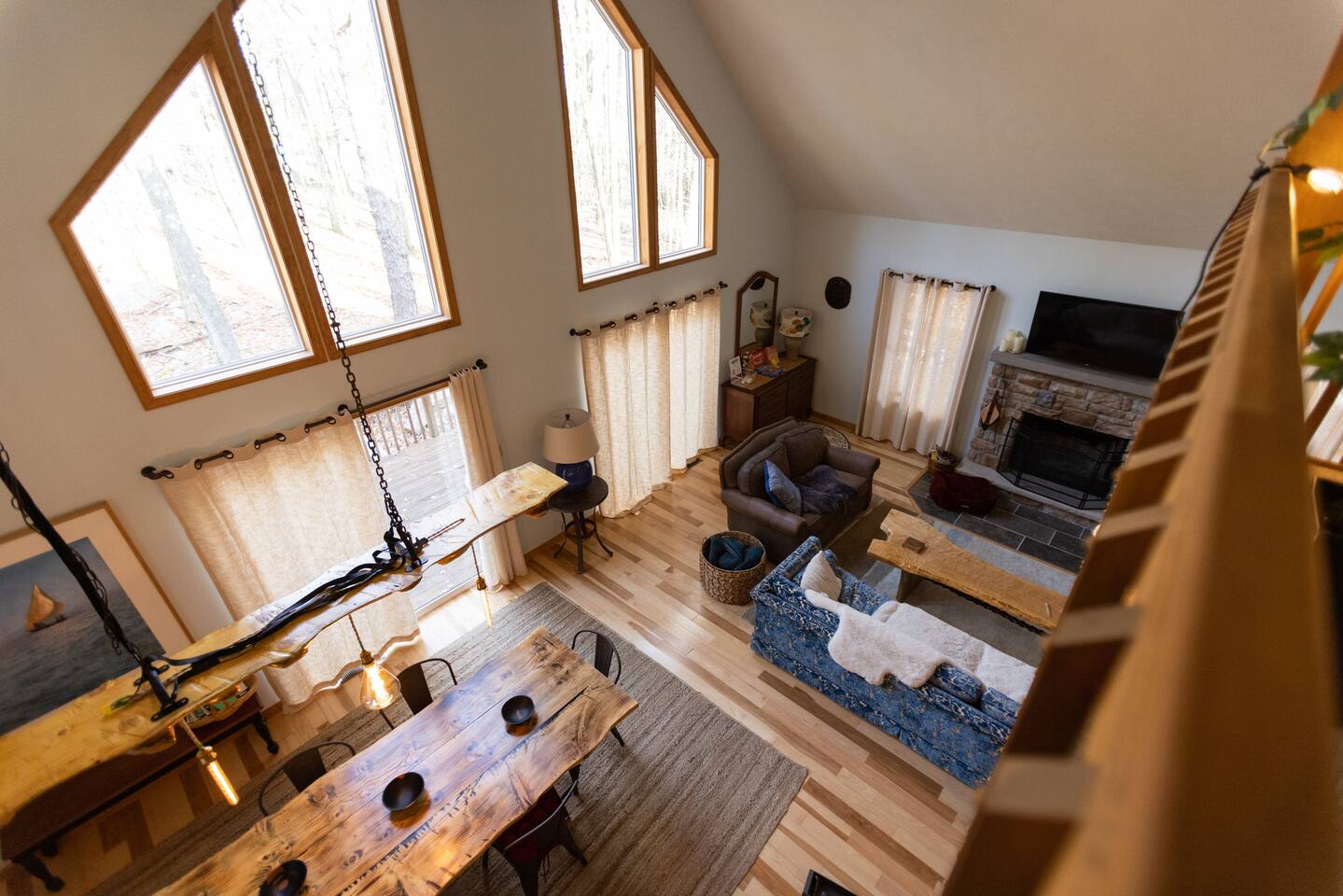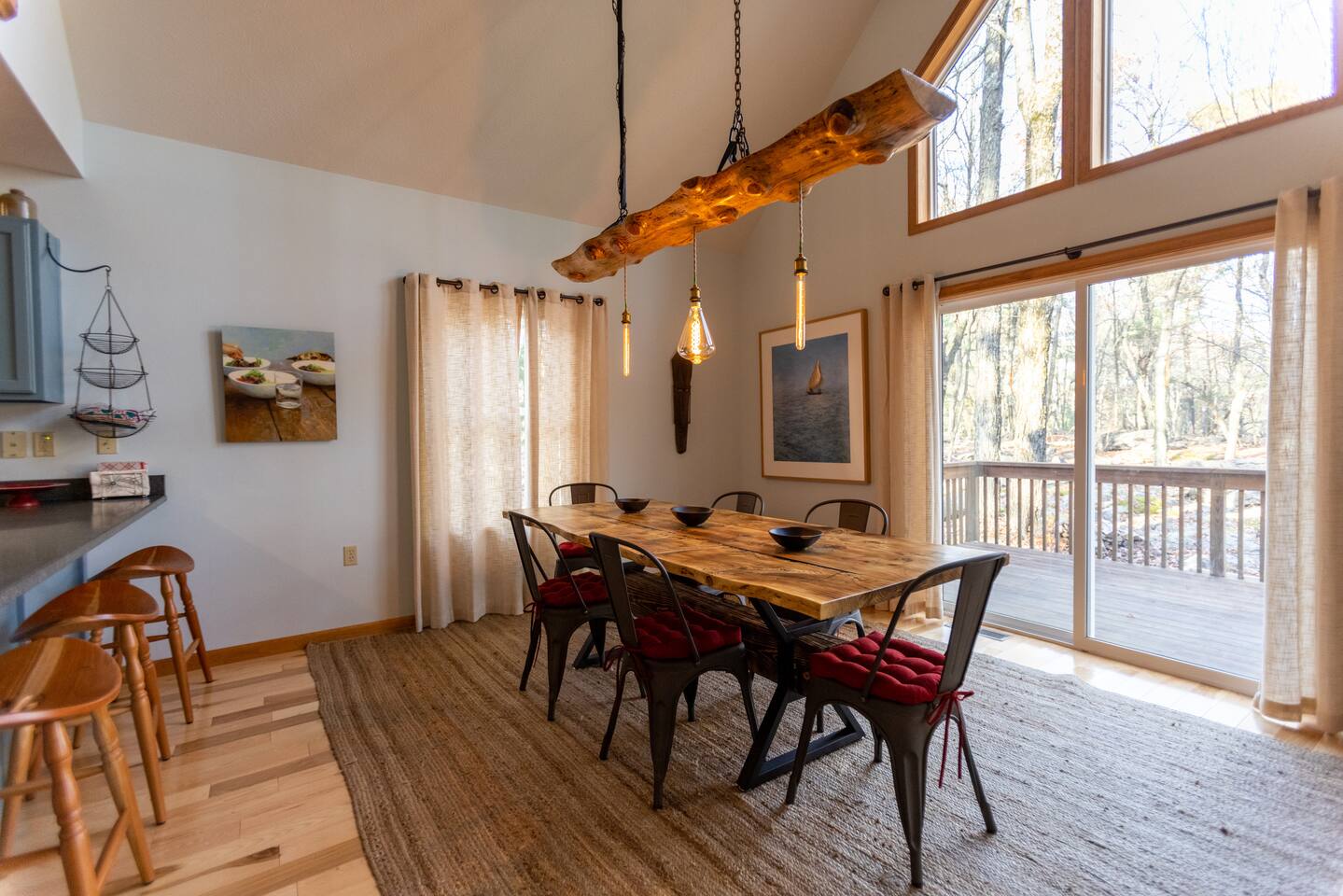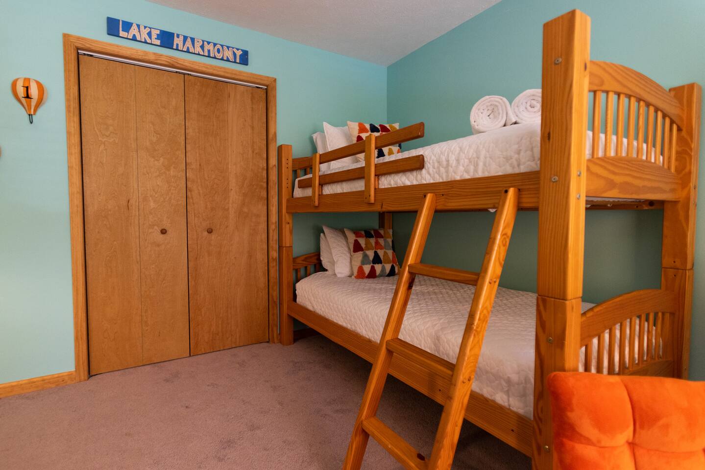 Cozy up by the wood burning fireplace with a cup filled with hot chocolate and marshmallows or sit in the Adirondack chairs and enjoy S’mores from the outdoor firepit – firewood available at the home! The lakeview, just a short hike from the back deck, will imprint a lasting memory. You will not want to leave! Soak in the hot tub, fit for 6-people hot tub with massage jets targeting specific muscle groups, providing the best massage experience. Gaze up at the stars in a rocking chair on the large wraparound deck. Walking through the home you will immerse yourself within a beautiful art gallery, all painted by a local artist. Prepare a wonderfully cooked meal in this NEWLY, full stocked kitchen with stainless steel appliances. Gather around the hand-crafted live edge wood table for a family feast. The kitchen and dining room comfortably fits 6 adults and 4 children. Everyone can then make their way up to the open loft to wind down, read a book or play a few board games. Do you like to grill? Great! We provide a full premium propane grill so you can feel confident showing off your Grill Master skills. The spacious king bedroom offers an en-suite full bathroom with a double vanity; great for getting ready for a night out. Kids will enjoy the bunk/playroom where they can connect their own gaming console. The home is equipped with central A/C and heating so guests can feel comfortable all year round. This amazing home is located near all the fun at Lake Harmony! There are so many activities to participate in, you may not be able to fit it all in one stay. Hiking, snowboarding, skiing, tubing, golfing, fishing, boating (rentals available at the lake), canoeing, paddle-boarding, Split Rock’s Indoor waterpark, movie theater, arcade, bowling alley, spa, hair salon, lake and beach, mini golf, tennis, paintballing, basketball, ATV tours, lakefront restaurants & bars, and more. Skiing/Snowboarding: > Big Boulder (5min drive) > Jack Frost (10min drive) > Camelback Ski Resort (30min drive) Nearby Attractions: > NASCAR Pocono Raceway (10min Drive) > Hickory Run State Park (20min Drive) > Kalahari Indoor Waterpark (25min Drive) > Jim Thorpe (25min Drive) > Camelbeach Waterpark (30min Drive) Wine & Beer: > Big Creek Vineyard (25min Drive) > Barley Creek Brewing Company (25min Drive) > Mountain View Vineyard, Winery & Brewery (30min Drive) > Pocono Brewing Company (30min Drive) > Blue Ridge Estate Vineyard & Winery (35min Drive) *BOOK RIGHT NOW* Before It’s Too Late! --SUMMARY OF PROPERTY-- Features: > 6-Person Hot Tub Spa > 2 Large Bathrooms with Double-Sink Vanities > 4K UHD Smart TVs > Wood-burning Fireplace (Firewood Available) > 2nd Floor Loft Hangout Space > Newly Remodeled Kitchen with Stainless Steel Appliances > Central Air-Conditioning and Heating > Coffee Machine > Reliable Wifi > Unique Interior Design > Laptop workspace > Outdoor Yard Games (Cornhole and Ring Toss) Sleeping Areas: > 2 King Size, and 4 Bunkbeds w/ Premium Mattresses > 1 Pullout Sleeper Sofa, Twin Size > 4K Smart TV in King Size Bedroom > MAXIMUM 6 Adults Fully Equipped Chef’s Kitchen: > NEW Stainless-Steel Appliances > Large French Door Refrigerator & Freezer > Eat-In Kitchen Peninsula (Seats 4) > Drip Coffee Machine > Baking sheets > Toaster > Measuring cups and spoons > Bottle opener & wine bottle opener > Can opener > Grilling utensils > Cutting boards, mixing bowls, serving bowls and trays > All utensils, cookware, dinnerware, and glassware Dining > Hand-Crafted Dining Table (Seats 6) plus 4 at the Eat-In Peninsula Entertainment: > Board Games > Lawn games including cornhole and ring toss Outdoor Space: > 6-Person Hot Tub w/ Massage Jets > Fire Pit and Adirondack Chairs > Propane Grill (Propane is Provided) > Hammock > Rocking Chairs