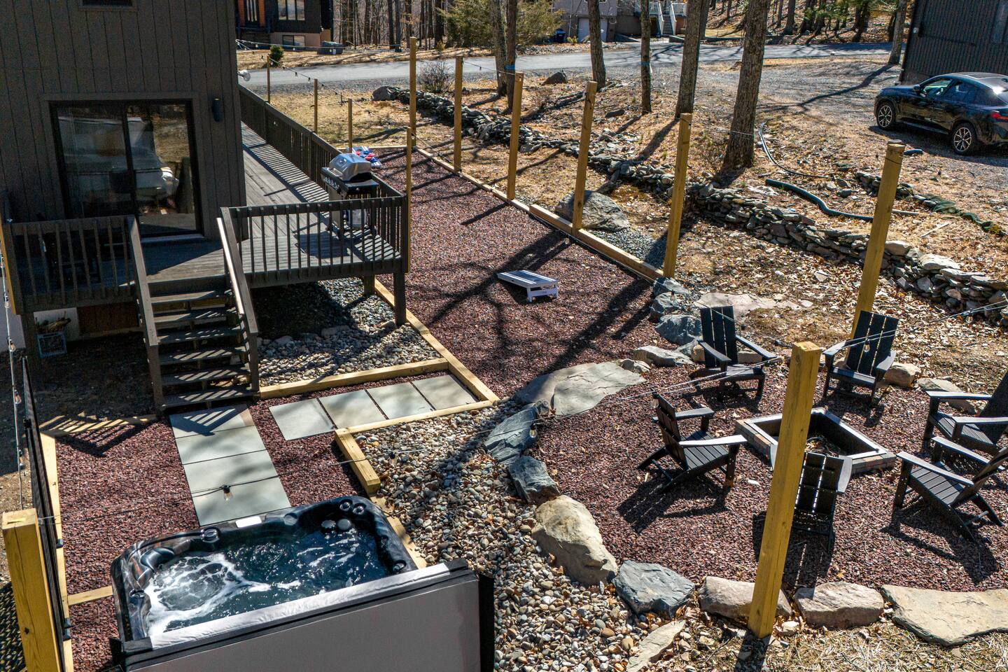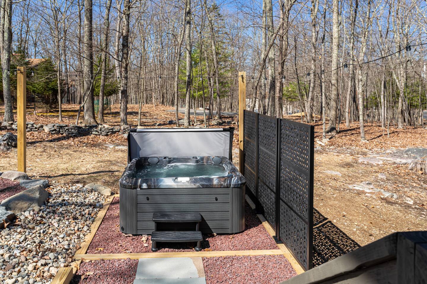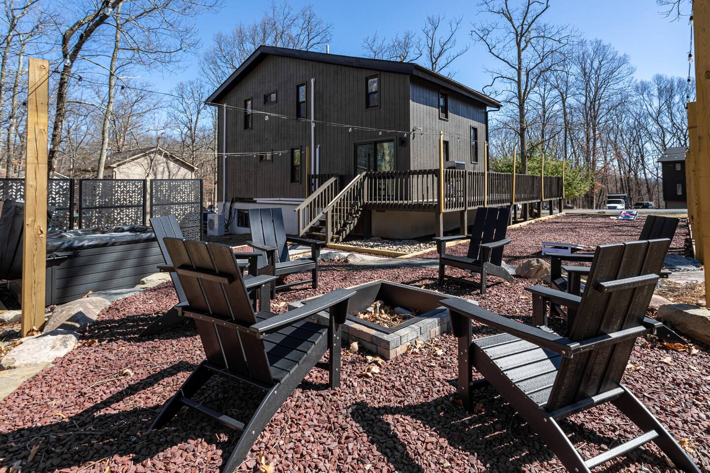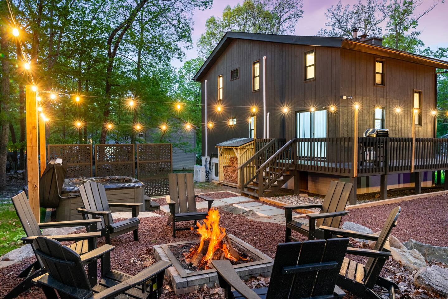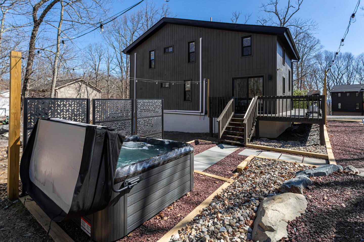 Get ready for unforgettable memories in this fun-filled mountain escape! Whether you're soaking in the hot tub, sharing laughs around the firepit, or enjoying all the nearby adventures, this home sets the stage for nonstop good times. With plenty of space, comfort, and activities for everyone, every moment—from morning coffee to late-night games—will feel special. It’s the kind of place where stories are made and no one wants to leave. -15 min to Downtown East Stroudsburg -15 min to Camelback Ski Resort -15 min to Premium Outlets -18 min to closest winery -20 min to Delaware Water Gap -25 min to Kalahari Resorts -28 min to Shawnee Mountain KEY FEATURES: *Sleeps 10 guests, 3 bedrooms; 3 Queen, 2 Twin + 1 pull out couch beds *3.5 Bathrooms *Dog Friendly *Modern and well-equipped kitchen *game room, ping pong table, shuffleboard + arcade machine *indoor fireplace *hot tub *fire pit **BEDROOMS** The main-floor bedroom is a serene retreat tucked just off the heart of the home, featuring a plush queen bed, a cozy sofa for reading or relaxing, and direct access to the backyard hot tub area as well as a beautifully renovated en-suite bathroom with sleek finishes and a spa-like shower—ideal for guests who prefer more privacy. Upstairs, you'll find two inviting bedrooms connected by a spacious, lofted living area that’s perfect for quiet mornings or late-night chats. One of the bedrooms is thoughtfully designed with both comfort and flexibility in mind, offering a queen bed and a twin daybed with a hidden trundle—perfect for kids, teens, or extra guests. The second upstairs bedroom is warm and welcoming, anchored by a queen bed and bathed in natural light. Each bedroom features its own heating and AC controls, ample closet space, and a dresser to make everyone feel right at home. The lofted living room also features a pull-out couch, offering an additional sleeping option for two more guests without sacrificing comfort. Whether it’s extra room for a large group or a cozy spot for a movie night, this space adds versatility to your stay. **BATHROOMS** Each bathroom in this home is thoughtfully designed to blend style and comfort, ensuring every guest enjoys a refreshing and convenient experience. On the main level, just off the living room, a modern rustic half-bath exudes charm with its warm wooden wall feature, creating a cozy spa-like feel that perfectly complements the home’s natural surroundings. Steps away, the en-suite bathroom in the main-floor bedroom is a true retreat, newly renovated with striking deep green tiles that add a touch of sophistication. A sleek walk-in shower with modern fixtures completes the space, offering a spa-like experience. Upstairs, nestled between the two bedrooms, the second-floor bathroom features contemporary finishes and a full bathtub—ideal for getting the kids ready for bed after a day of outdoor adventures. Soft lighting and elegant design make it a peaceful sanctuary for winding down. Finally, on the lower level, near the lively game room, the basement bathroom provides both function and convenience. Featuring a stand-up shower, it’s perfect for rinsing off after an active day, while the nearby washer and dryer add extra practicality for longer stays. Whether rustic or refined, each bathroom in this home is designed to provide both comfort and style. **LIVING ROOM, KITCHEN + DINING ROOM** As you enter this inviting home, the expansive open-concept living space immediately captures your attention. The living room boasts soaring high ceilings, a modern fireplace, and stylish, comfortable furniture, including a large sofa and smart TV, creating a cozy yet grand atmosphere. To your left, stairs lead up to the lofted living room area, offering a quiet retreat with a view of the main floor. The living room flows seamlessly into the newly renovated kitchen and dining area, designed for both function and style. The chef’s kitchen is fully equipped with top-of-the-line appliances, perfect for any meal, while the dining area features a wooden table with seating for eight and additional seating at the kitchen peninsula. Just off the dining room, glass doors open to an outdoor dining area with privacy covers, offering a peaceful spot to enjoy meals in nature. This space is perfect for gathering, relaxing, and creating lasting memories. **GAME ROOM** Downstairs, the game room offers the perfect blend of fun and relaxation, making it an ideal spot for guests of all ages. The space is filled with excitement, featuring a ping pong table and a shuffleboard for friendly competition. For those nostalgic for classic games, the arcade game adds a playful touch, while a large TV and cozy lounging area invite you to relax between rounds. A collection of board games is also available, providing endless options for entertainment. Whether you're gearing up for a game night or simply unwinding after a day of adventure, this lively and inviting room promises hours of enjoyment. **OUTDOOR AREA** Step outside to a beautifully landscaped outdoor haven, designed for both relaxation and fun. The space is bathed in the warm glow of string lights that twinkle overhead, creating an enchanting atmosphere as dusk falls. At the heart of the outdoor area is a modern firepit, surrounded by six cozy Adirondack chairs, perfect for gathering around the flames and sharing stories under the stars. Just a few steps away, a newly installed hot tub awaits, offering a soothing escape for up to six guests, where you can unwind and soak in the serene surroundings. For added entertainment, a designated area for outdoor games like cornhole ensures there's always something to do. Whether you're enjoying a peaceful evening by the fire or a lively game with friends, this outdoor retreat is the perfect place to enjoy your family and friends. **COMMUNITY AMENITIES** The community offers a range of recreational facilities, including swimming pools, tennis and basketball courts, and playgrounds, 