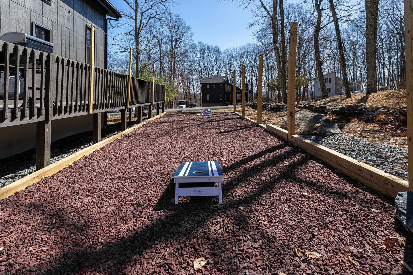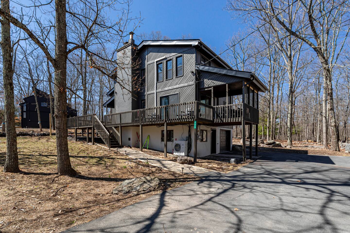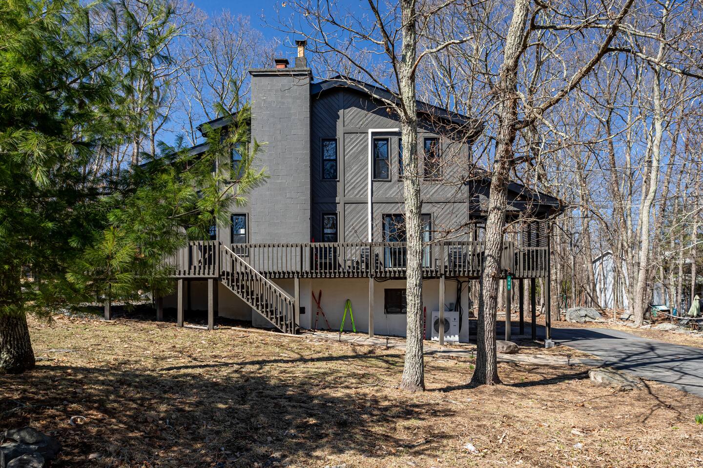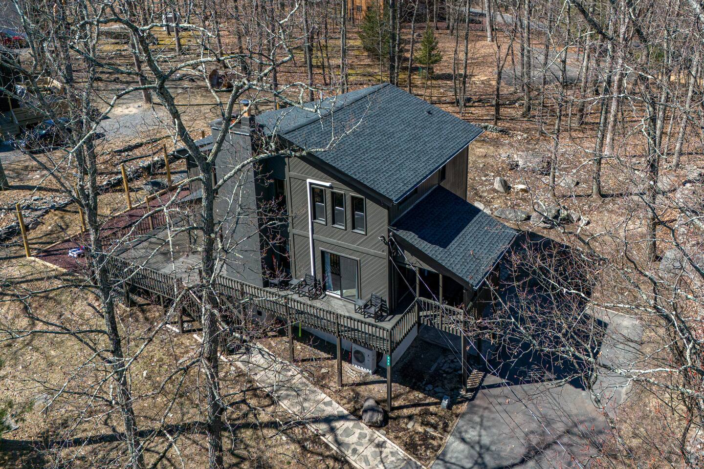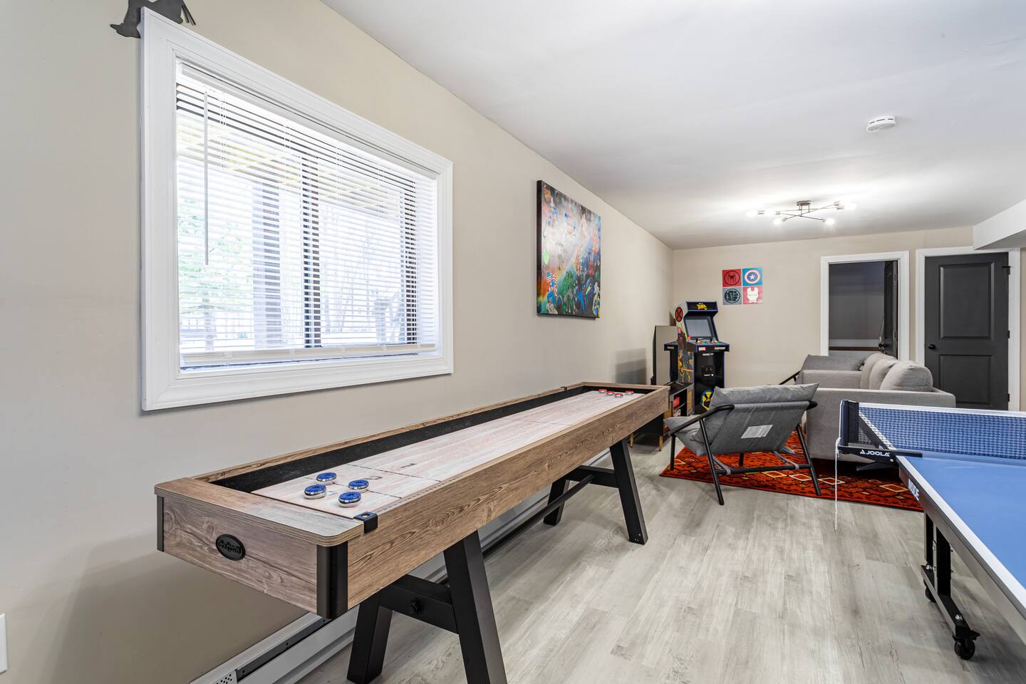 Get ready for unforgettable memories in this fun-filled mountain escape! Whether you're soaking in the hot tub, sharing laughs around the firepit, or enjoying all the nearby adventures, this home sets the stage for nonstop good times. With plenty of space, comfort, and activities for everyone, every moment—from morning coffee to late-night games—will feel special. It’s the kind of place where stories are made and no one wants to leave. -15 min to Downtown East Stroudsburg -15 min to Camelback Ski Resort -15 min to Premium Outlets -18 min to closest winery -20 min to Delaware Water Gap -25 min to Kalahari Resorts -28 min to Shawnee Mountain KEY FEATURES: *Sleeps 10 guests, 3 bedrooms; 3 Queen, 2 Twin + 1 pull out couch beds *3.5 Bathrooms *Dog Friendly *Modern and well-equipped kitchen *game room, ping pong table, shuffleboard + arcade machine *indoor fireplace *hot tub *fire pit **BEDROOMS** The main-floor bedroom is a serene retreat tucked just off the heart of the home, featuring a plush queen bed, a cozy sofa for reading or relaxing, and direct access to the backyard hot tub area as well as a beautifully renovated en-suite bathroom with sleek finishes and a spa-like shower—ideal for guests who prefer more privacy. Upstairs, you'll find two inviting bedrooms connected by a spacious, lofted living area that’s perfect for quiet mornings or late-night chats. One of the bedrooms is thoughtfully designed with both comfort and flexibility in mind, offering a queen bed and a twin daybed with a hidden trundle—perfect for kids, teens, or extra guests. The second upstairs bedroom is warm and welcoming, anchored by a queen bed and bathed in natural light. Each bedroom features its own heating and AC controls, ample closet space, and a dresser to make everyone feel right at home. The lofted living room also features a pull-out couch, offering an additional sleeping option for two more guests without sacrificing comfort. Whether it’s extra room for a large group or a cozy spot for a movie night, this space adds versatility to your stay. **BATHROOMS** Each bathroom in this home is thoughtfully designed to blend style and comfort, ensuring every guest enjoys a refreshing and convenient experience. On the main level, just off the living room, a modern rustic half-bath exudes charm with its warm wooden wall feature, creating a cozy spa-like feel that perfectly complements the home’s natural surroundings. Steps away, the en-suite bathroom in the main-floor bedroom is a true retreat, newly renovated with striking deep green tiles that add a touch of sophistication. A sleek walk-in shower with modern fixtures completes the space, offering a spa-like experience. Upstairs, nestled between the two bedrooms, the second-floor bathroom features contemporary finishes and a full bathtub—ideal for getting the kids ready for bed after a day of outdoor adventures. Soft lighting and elegant design make it a peaceful sanctuary for winding down. Finally, on the lower level, near the lively game room, the basement bathroom provides both function and convenience. Featuring a stand-up shower, it’s perfect for rinsing off after an active day, while the nearby washer and dryer add extra practicality for longer stays. Whether rustic or refined, each bathroom in this home is designed to provide both comfort and style. **LIVING ROOM, KITCHEN + DINING ROOM** As you enter this inviting home, the expansive open-concept living space immediately captures your attention. The living room boasts soaring high ceilings, a modern fireplace, and stylish, comfortable furniture, including a large sofa and smart TV, creating a cozy yet grand atmosphere. To your left, stairs lead up to the lofted living room area, offering a quiet retreat with a view of the main floor. The living room flows seamlessly into the newly renovated kitchen and dining area, designed for both function and style. The chef’s kitchen is fully equipped with top-of-the-line appliances, perfect for any meal, while the dining area features a wooden table with seating for eight and additional seating at the kitchen peninsula. Just off the dining room, glass doors open to an outdoor dining area with privacy covers, offering a peaceful spot to enjoy meals in nature. This space is perfect for gathering, relaxing, and creating lasting memories. **GAME ROOM** Downstairs, the game room offers the perfect blend of fun and relaxation, making it an ideal spot for guests of all ages. The space is filled with excitement, featuring a ping pong table and a shuffleboard for friendly competition. For those nostalgic for classic games, the arcade game adds a playful touch, while a large TV and cozy lounging area invite you to relax between rounds. A collection of board games is also available, providing endless options for entertainment. Whether you're gearing up for a game night or simply unwinding after a day of adventure, this lively and inviting room promises hours of enjoyment. **OUTDOOR AREA** Step outside to a beautifully landscaped outdoor haven, designed for both relaxation and fun. The space is bathed in the warm glow of string lights that twinkle overhead, creating an enchanting atmosphere as dusk falls. At the heart of the outdoor area is a modern firepit, surrounded by six cozy Adirondack chairs, perfect for gathering around the flames and sharing stories under the stars. Just a few steps away, a newly installed hot tub awaits, offering a soothing escape for up to six guests, where you can unwind and soak in the serene surroundings. For added entertainment, a designated area for outdoor games like cornhole ensures there's always something to do. Whether you're enjoying a peaceful evening by the fire or a lively game with friends, this outdoor retreat is the perfect place to enjoy your family and friends. **COMMUNITY AMENITIES** The community offers a range of recreational facilities, including swimming pools, tennis and basketball courts, and playgrounds, 