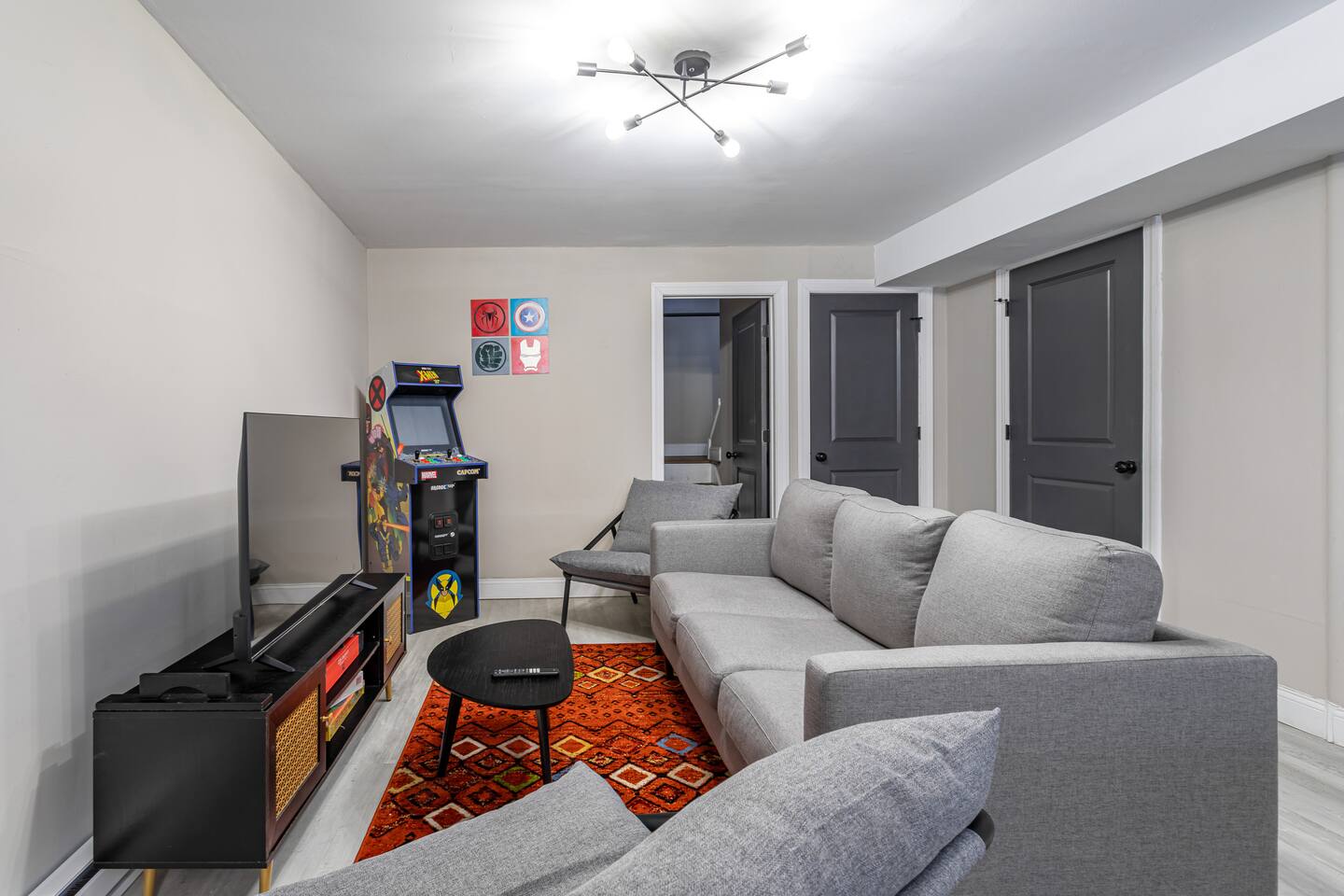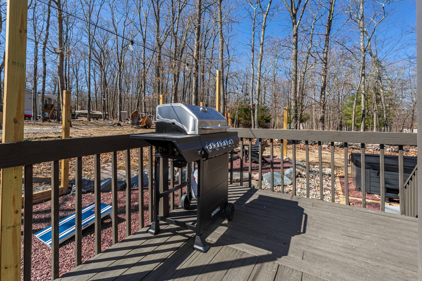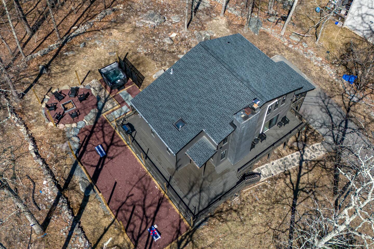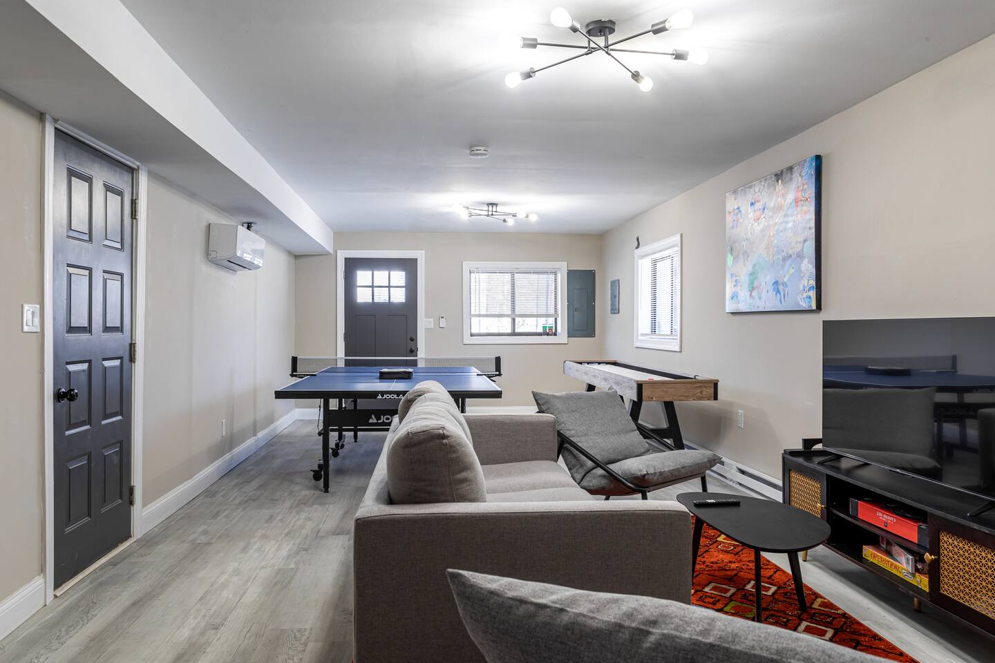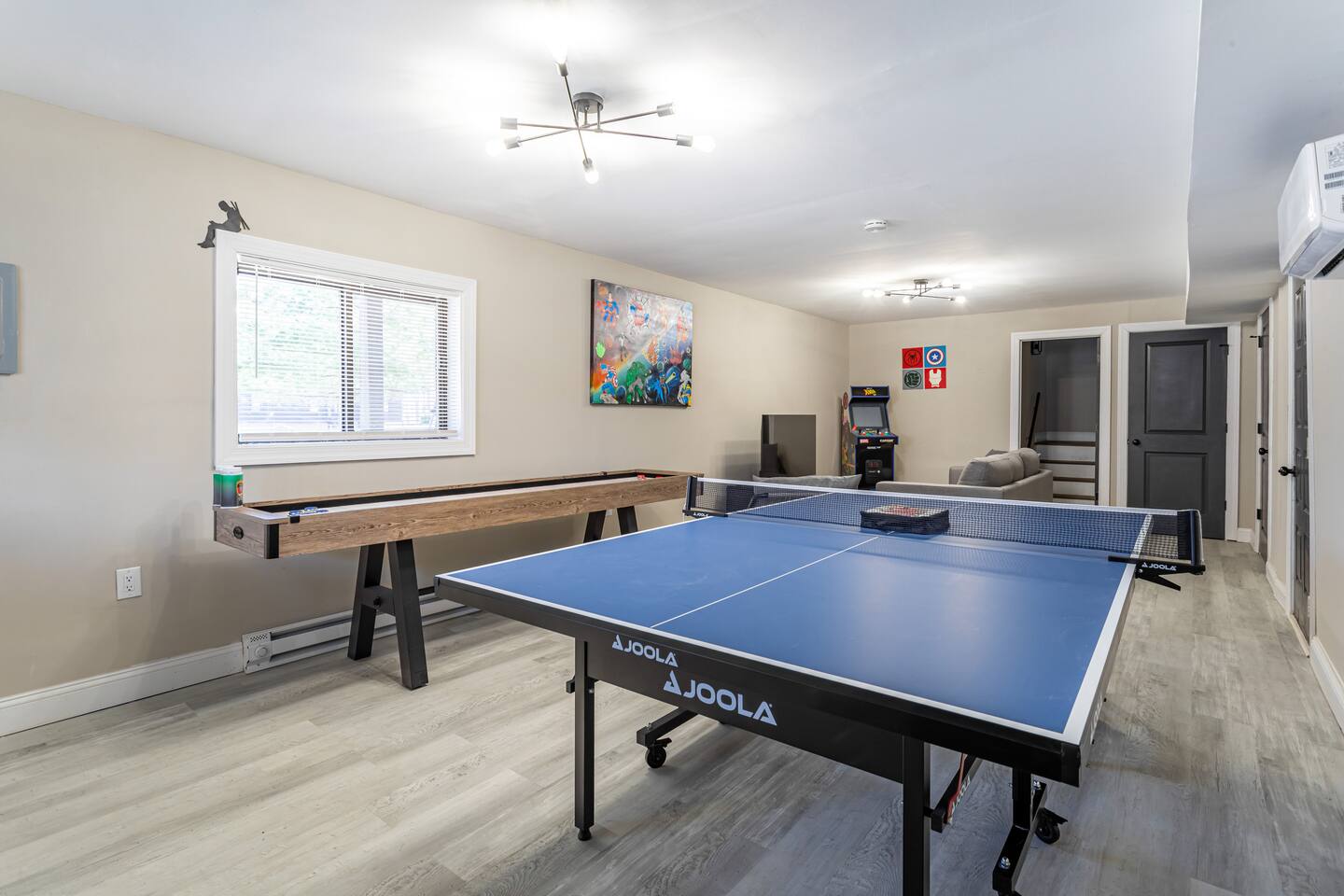 Get ready for unforgettable memories in this fun-filled mountain escape! Whether you're soaking in the hot tub, sharing laughs around the firepit, or enjoying all the nearby adventures, this home sets the stage for nonstop good times. With plenty of space, comfort, and activities for everyone, every moment—from morning coffee to late-night games—will feel special. It’s the kind of place where stories are made and no one wants to leave. -15 min to Downtown East Stroudsburg -15 min to Camelback Ski Resort -15 min to Premium Outlets -18 min to closest winery -20 min to Delaware Water Gap -25 min to Kalahari Resorts -28 min to Shawnee Mountain KEY FEATURES: *Sleeps 10 guests, 3 bedrooms; 3 Queen, 2 Twin + 1 pull out couch beds *3.5 Bathrooms *Dog Friendly *Modern and well-equipped kitchen *game room, ping pong table, shuffleboard + arcade machine *indoor fireplace *hot tub *fire pit **BEDROOMS** The main-floor bedroom is a serene retreat tucked just off the heart of the home, featuring a plush queen bed, a cozy sofa for reading or relaxing, and direct access to the backyard hot tub area as well as a beautifully renovated en-suite bathroom with sleek finishes and a spa-like shower—ideal for guests who prefer more privacy. Upstairs, you'll find two inviting bedrooms connected by a spacious, lofted living area that’s perfect for quiet mornings or late-night chats. One of the bedrooms is thoughtfully designed with both comfort and flexibility in mind, offering a queen bed and a twin daybed with a hidden trundle—perfect for kids, teens, or extra guests. The second upstairs bedroom is warm and welcoming, anchored by a queen bed and bathed in natural light. Each bedroom features its own heating and AC controls, ample closet space, and a dresser to make everyone feel right at home. The lofted living room also features a pull-out couch, offering an additional sleeping option for two more guests without sacrificing comfort. Whether it’s extra room for a large group or a cozy spot for a movie night, this space adds versatility to your stay. **BATHROOMS** Each bathroom in this home is thoughtfully designed to blend style and comfort, ensuring every guest enjoys a refreshing and convenient experience. On the main level, just off the living room, a modern rustic half-bath exudes charm with its warm wooden wall feature, creating a cozy spa-like feel that perfectly complements the home’s natural surroundings. Steps away, the en-suite bathroom in the main-floor bedroom is a true retreat, newly renovated with striking deep green tiles that add a touch of sophistication. A sleek walk-in shower with modern fixtures completes the space, offering a spa-like experience. Upstairs, nestled between the two bedrooms, the second-floor bathroom features contemporary finishes and a full bathtub—ideal for getting the kids ready for bed after a day of outdoor adventures. Soft lighting and elegant design make it a peaceful sanctuary for winding down. Finally, on the lower level, near the lively game room, the basement bathroom provides both function and convenience. Featuring a stand-up shower, it’s perfect for rinsing off after an active day, while the nearby washer and dryer add extra practicality for longer stays. Whether rustic or refined, each bathroom in this home is designed to provide both comfort and style. **LIVING ROOM, KITCHEN + DINING ROOM** As you enter this inviting home, the expansive open-concept living space immediately captures your attention. The living room boasts soaring high ceilings, a modern fireplace, and stylish, comfortable furniture, including a large sofa and smart TV, creating a cozy yet grand atmosphere. To your left, stairs lead up to the lofted living room area, offering a quiet retreat with a view of the main floor. The living room flows seamlessly into the newly renovated kitchen and dining area, designed for both function and style. The chef’s kitchen is fully equipped with top-of-the-line appliances, perfect for any meal, while the dining area features a wooden table with seating for eight and additional seating at the kitchen peninsula. Just off the dining room, glass doors open to an outdoor dining area with privacy covers, offering a peaceful spot to enjoy meals in nature. This space is perfect for gathering, relaxing, and creating lasting memories. **GAME ROOM** Downstairs, the game room offers the perfect blend of fun and relaxation, making it an ideal spot for guests of all ages. The space is filled with excitement, featuring a ping pong table and a shuffleboard for friendly competition. For those nostalgic for classic games, the arcade game adds a playful touch, while a large TV and cozy lounging area invite you to relax between rounds. A collection of board games is also available, providing endless options for entertainment. Whether you're gearing up for a game night or simply unwinding after a day of adventure, this lively and inviting room promises hours of enjoyment. **OUTDOOR AREA** Step outside to a beautifully landscaped outdoor haven, designed for both relaxation and fun. The space is bathed in the warm glow of string lights that twinkle overhead, creating an enchanting atmosphere as dusk falls. At the heart of the outdoor area is a modern firepit, surrounded by six cozy Adirondack chairs, perfect for gathering around the flames and sharing stories under the stars. Just a few steps away, a newly installed hot tub awaits, offering a soothing escape for up to six guests, where you can unwind and soak in the serene surroundings. For added entertainment, a designated area for outdoor games like cornhole ensures there's always something to do. Whether you're enjoying a peaceful evening by the fire or a lively game with friends, this outdoor retreat is the perfect place to enjoy your family and friends. **COMMUNITY AMENITIES** The community offers a range of recreational facilities, including swimming pools, tennis and basketball courts, and playgrounds, 