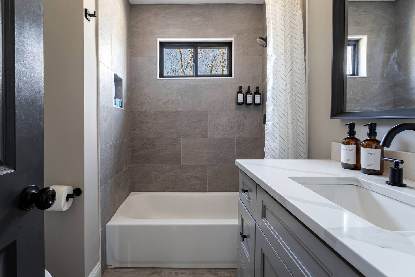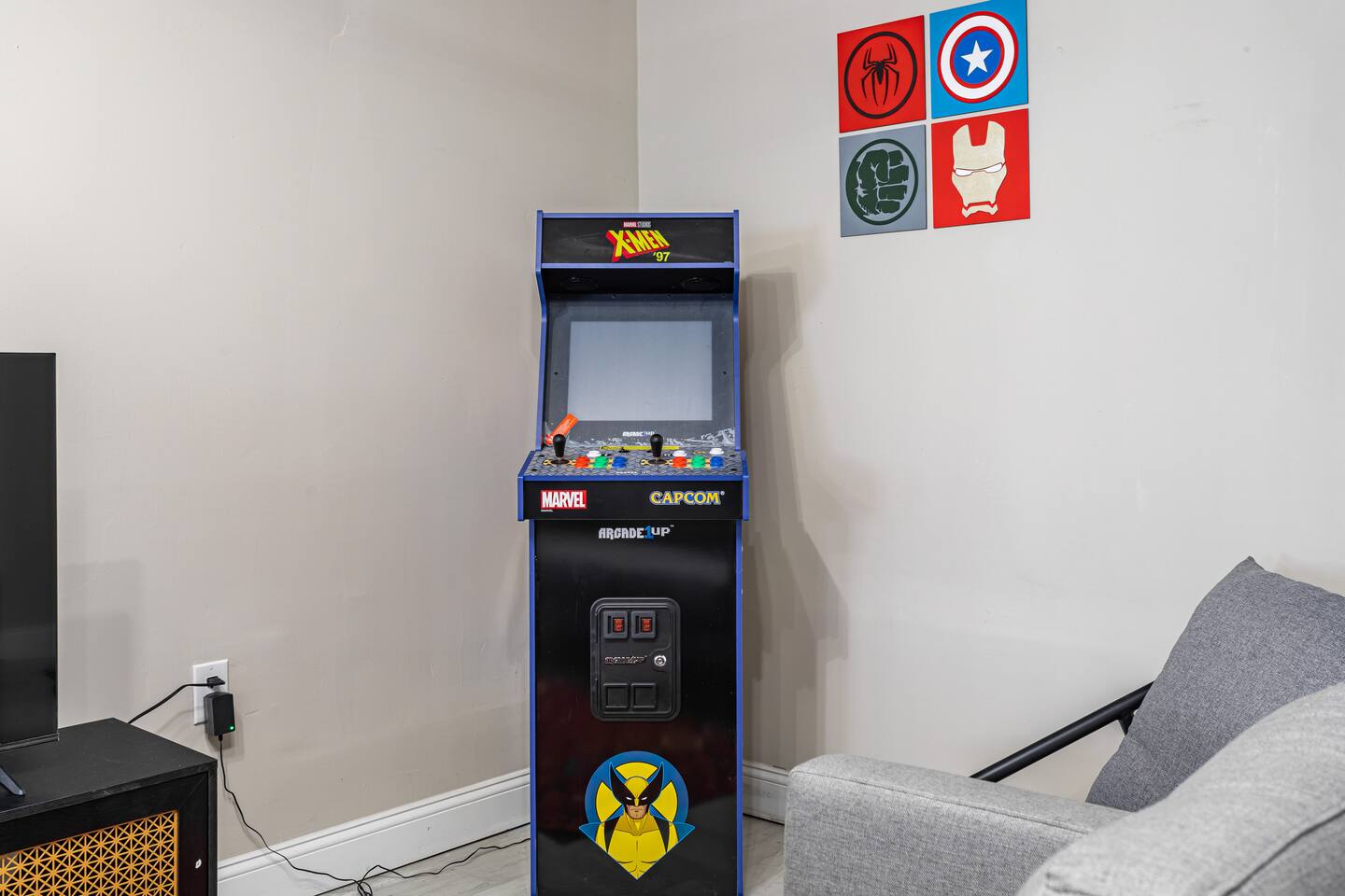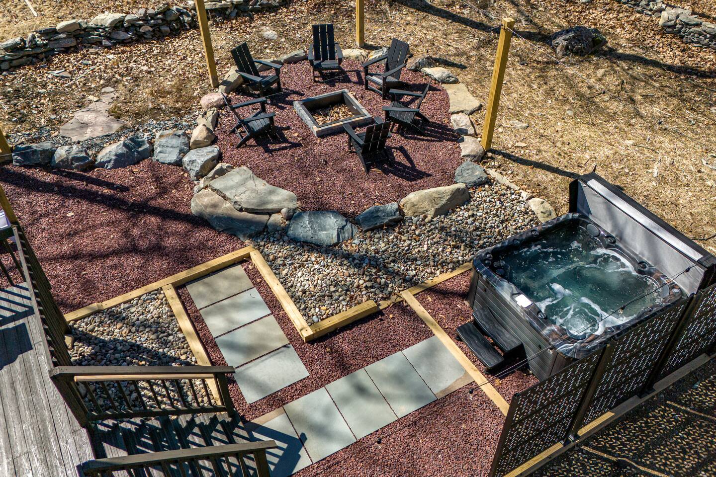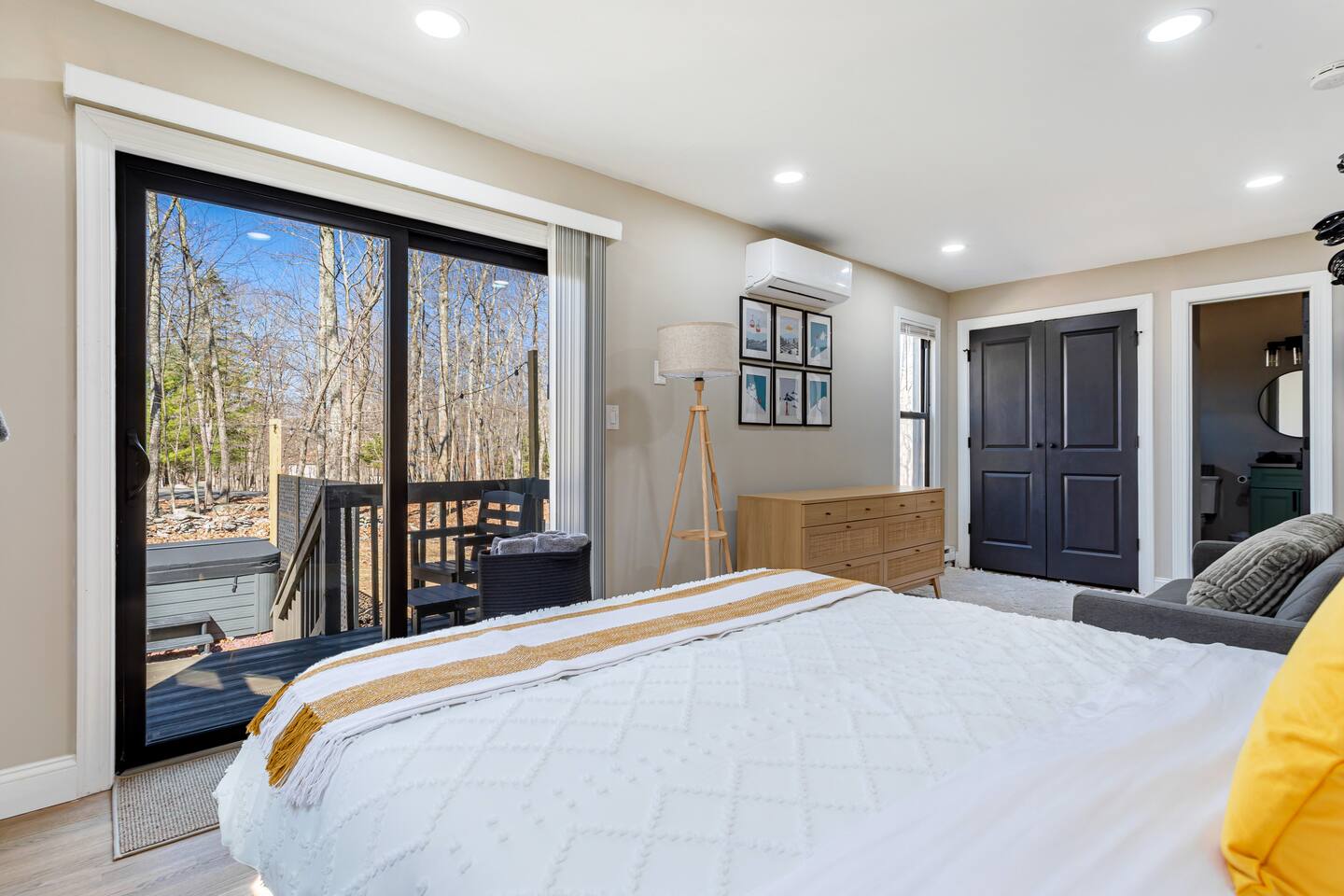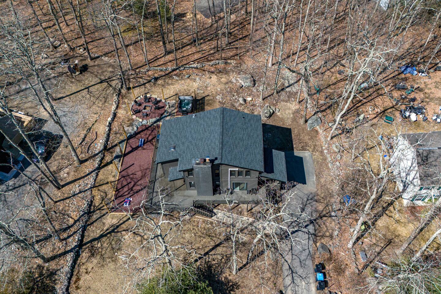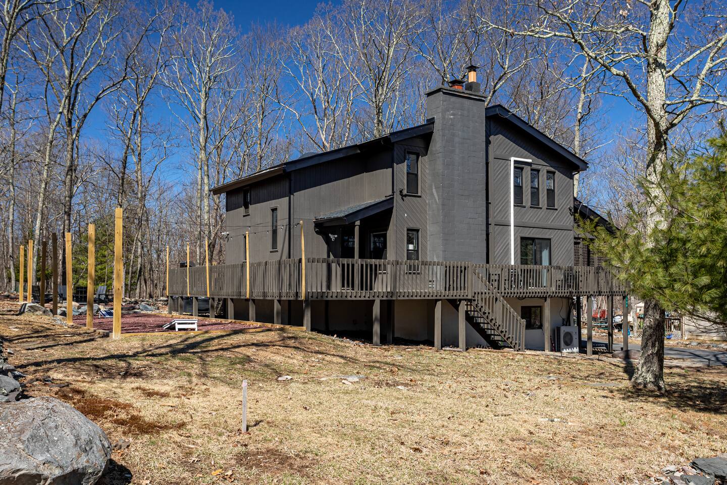 Get ready for unforgettable memories in this fun-filled mountain escape! Whether you're soaking in the hot tub, sharing laughs around the firepit, or enjoying all the nearby adventures, this home sets the stage for nonstop good times. With plenty of space, comfort, and activities for everyone, every moment—from morning coffee to late-night games—will feel special. It’s the kind of place where stories are made and no one wants to leave. -15 min to Downtown East Stroudsburg -15 min to Camelback Ski Resort -15 min to Premium Outlets -18 min to closest winery -20 min to Delaware Water Gap -25 min to Kalahari Resorts -28 min to Shawnee Mountain KEY FEATURES: *Sleeps 10 guests, 3 bedrooms; 3 Queen, 2 Twin + 1 pull out couch beds *3.5 Bathrooms *Dog Friendly *Modern and well-equipped kitchen *game room, ping pong table, shuffleboard + arcade machine *indoor fireplace *hot tub *fire pit **BEDROOMS** The main-floor bedroom is a serene retreat tucked just off the heart of the home, featuring a plush queen bed, a cozy sofa for reading or relaxing, and direct access to the backyard hot tub area as well as a beautifully renovated en-suite bathroom with sleek finishes and a spa-like shower—ideal for guests who prefer more privacy. Upstairs, you'll find two inviting bedrooms connected by a spacious, lofted living area that’s perfect for quiet mornings or late-night chats. One of the bedrooms is thoughtfully designed with both comfort and flexibility in mind, offering a queen bed and a twin daybed with a hidden trundle—perfect for kids, teens, or extra guests. The second upstairs bedroom is warm and welcoming, anchored by a queen bed and bathed in natural light. Each bedroom features its own heating and AC controls, ample closet space, and a dresser to make everyone feel right at home. The lofted living room also features a pull-out couch, offering an additional sleeping option for two more guests without sacrificing comfort. Whether it’s extra room for a large group or a cozy spot for a movie night, this space adds versatility to your stay. **BATHROOMS** Each bathroom in this home is thoughtfully designed to blend style and comfort, ensuring every guest enjoys a refreshing and convenient experience. On the main level, just off the living room, a modern rustic half-bath exudes charm with its warm wooden wall feature, creating a cozy spa-like feel that perfectly complements the home’s natural surroundings. Steps away, the en-suite bathroom in the main-floor bedroom is a true retreat, newly renovated with striking deep green tiles that add a touch of sophistication. A sleek walk-in shower with modern fixtures completes the space, offering a spa-like experience. Upstairs, nestled between the two bedrooms, the second-floor bathroom features contemporary finishes and a full bathtub—ideal for getting the kids ready for bed after a day of outdoor adventures. Soft lighting and elegant design make it a peaceful sanctuary for winding down. Finally, on the lower level, near the lively game room, the basement bathroom provides both function and convenience. Featuring a stand-up shower, it’s perfect for rinsing off after an active day, while the nearby washer and dryer add extra practicality for longer stays. Whether rustic or refined, each bathroom in this home is designed to provide both comfort and style. **LIVING ROOM, KITCHEN + DINING ROOM** As you enter this inviting home, the expansive open-concept living space immediately captures your attention. The living room boasts soaring high ceilings, a modern fireplace, and stylish, comfortable furniture, including a large sofa and smart TV, creating a cozy yet grand atmosphere. To your left, stairs lead up to the lofted living room area, offering a quiet retreat with a view of the main floor. The living room flows seamlessly into the newly renovated kitchen and dining area, designed for both function and style. The chef’s kitchen is fully equipped with top-of-the-line appliances, perfect for any meal, while the dining area features a wooden table with seating for eight and additional seating at the kitchen peninsula. Just off the dining room, glass doors open to an outdoor dining area with privacy covers, offering a peaceful spot to enjoy meals in nature. This space is perfect for gathering, relaxing, and creating lasting memories. **GAME ROOM** Downstairs, the game room offers the perfect blend of fun and relaxation, making it an ideal spot for guests of all ages. The space is filled with excitement, featuring a ping pong table and a shuffleboard for friendly competition. For those nostalgic for classic games, the arcade game adds a playful touch, while a large TV and cozy lounging area invite you to relax between rounds. A collection of board games is also available, providing endless options for entertainment. Whether you're gearing up for a game night or simply unwinding after a day of adventure, this lively and inviting room promises hours of enjoyment. **OUTDOOR AREA** Step outside to a beautifully landscaped outdoor haven, designed for both relaxation and fun. The space is bathed in the warm glow of string lights that twinkle overhead, creating an enchanting atmosphere as dusk falls. At the heart of the outdoor area is a modern firepit, surrounded by six cozy Adirondack chairs, perfect for gathering around the flames and sharing stories under the stars. Just a few steps away, a newly installed hot tub awaits, offering a soothing escape for up to six guests, where you can unwind and soak in the serene surroundings. For added entertainment, a designated area for outdoor games like cornhole ensures there's always something to do. Whether you're enjoying a peaceful evening by the fire or a lively game with friends, this outdoor retreat is the perfect place to enjoy your family and friends. **COMMUNITY AMENITIES** The community offers a range of recreational facilities, including swimming pools, tennis and basketball courts, and playgrounds, 