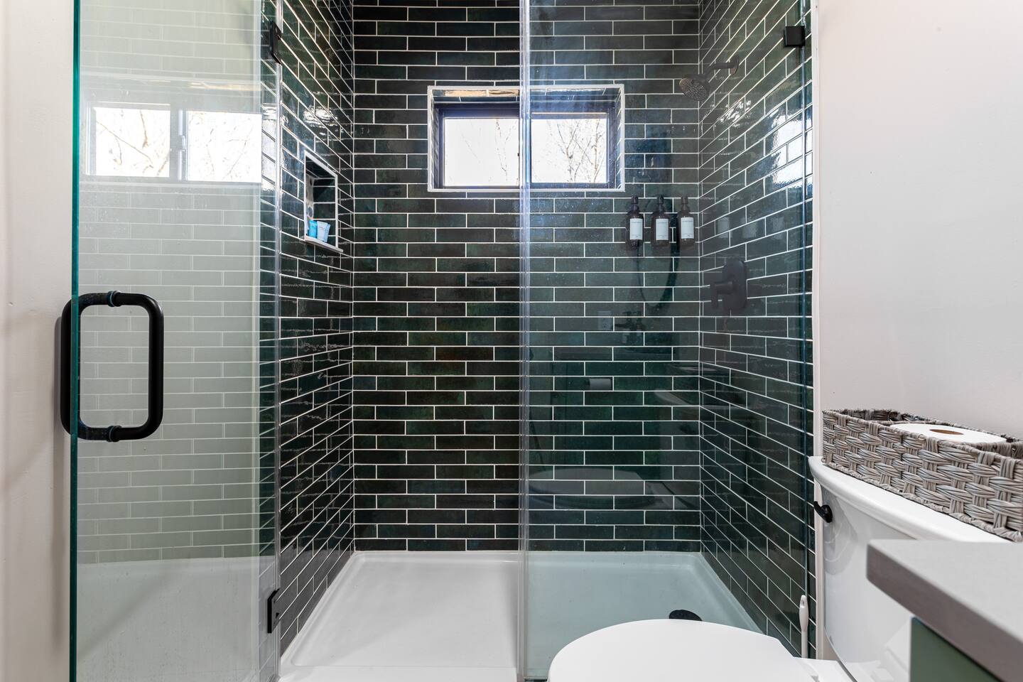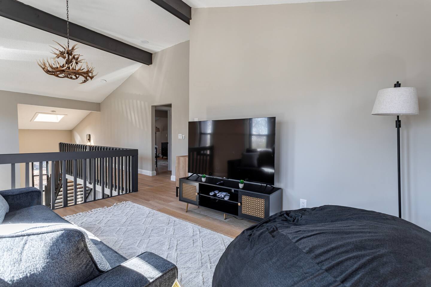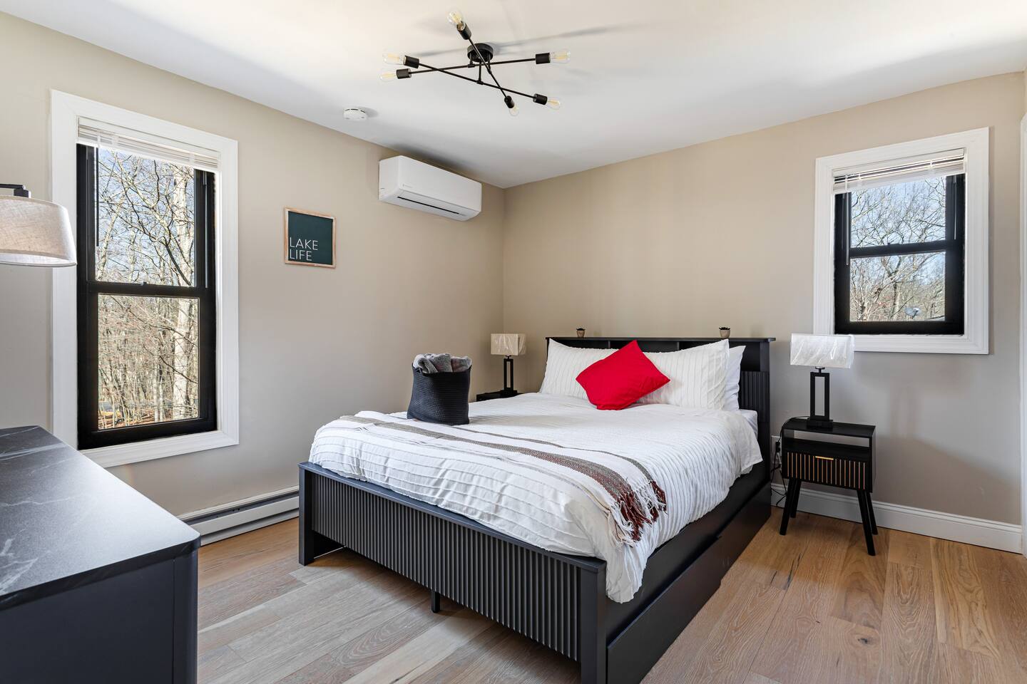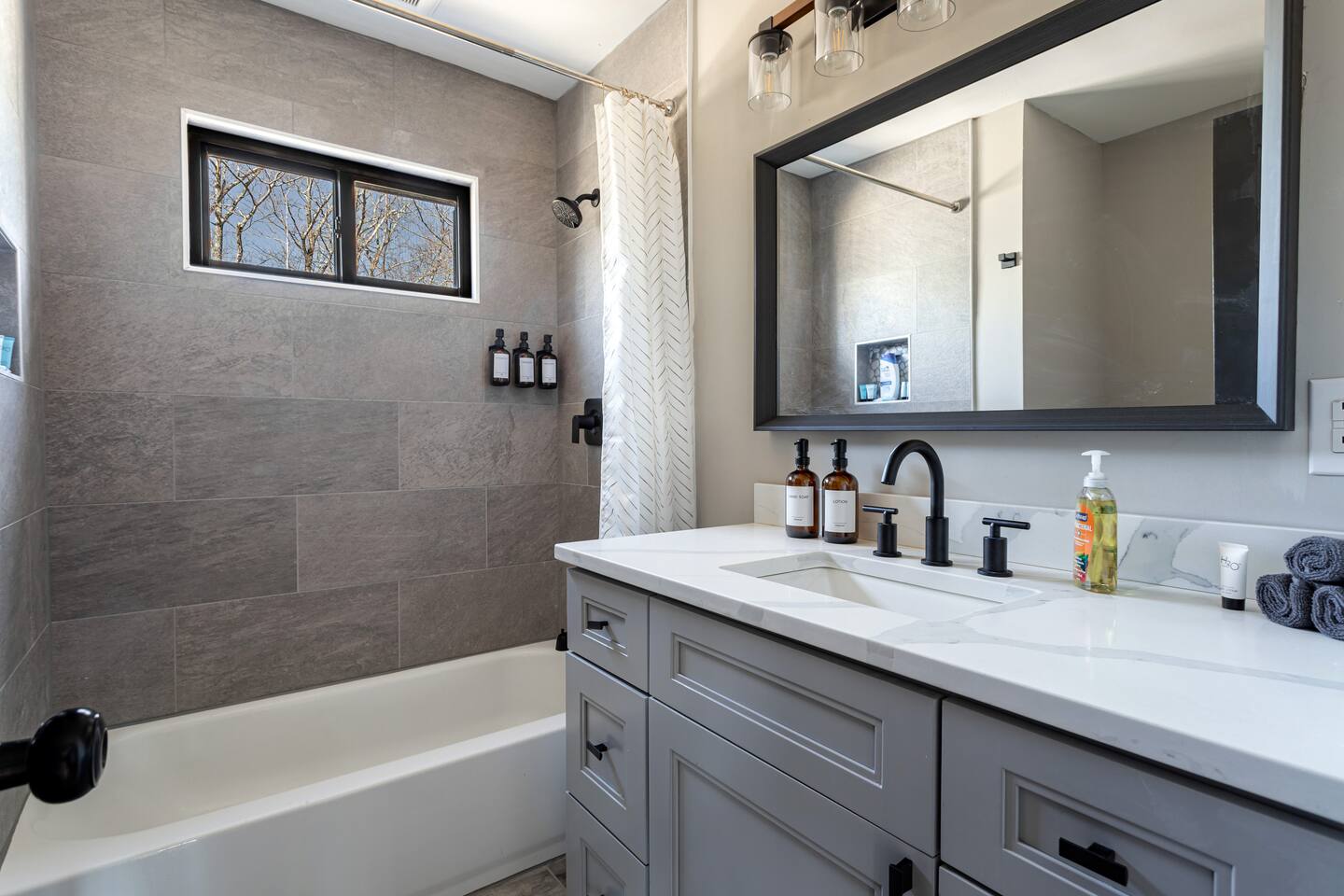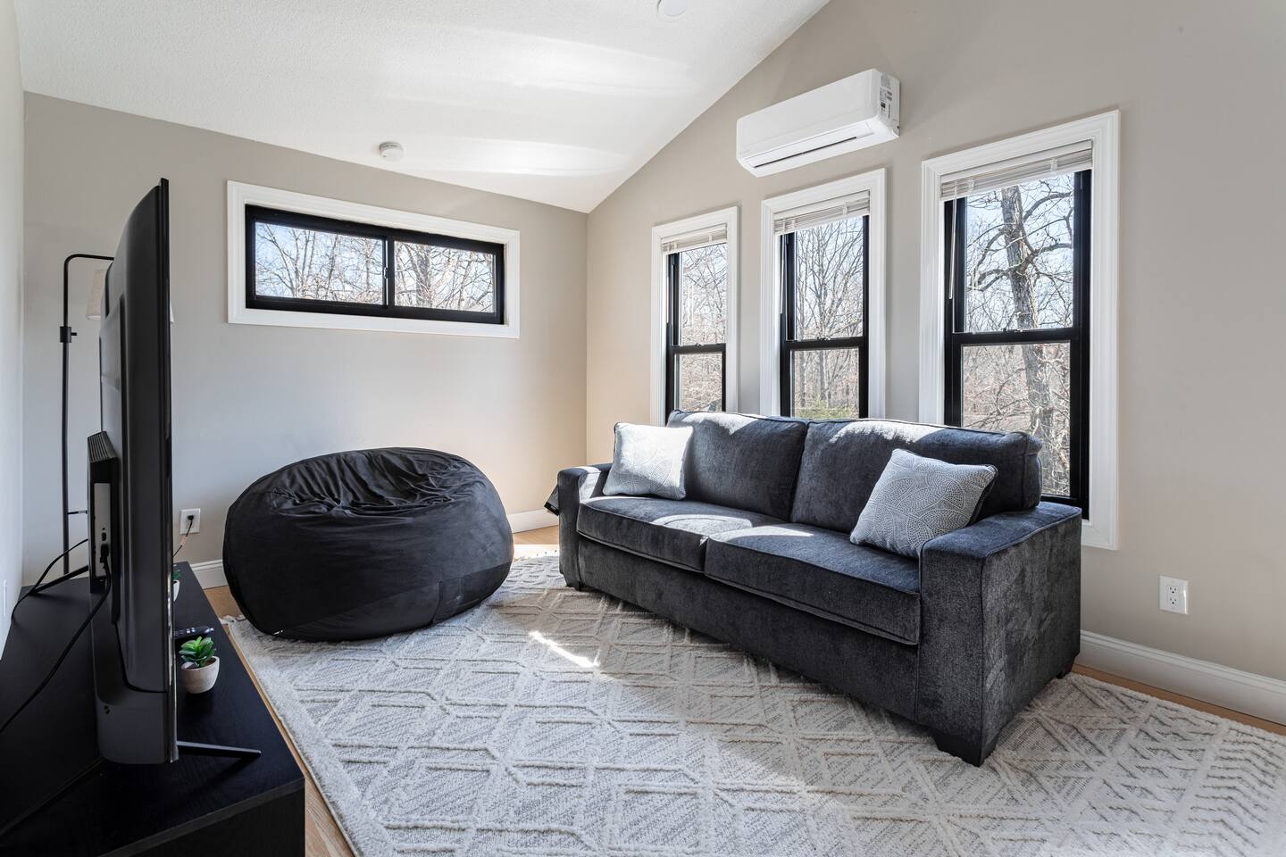 Get ready for unforgettable memories in this fun-filled mountain escape! Whether you're soaking in the hot tub, sharing laughs around the firepit, or enjoying all the nearby adventures, this home sets the stage for nonstop good times. With plenty of space, comfort, and activities for everyone, every moment—from morning coffee to late-night games—will feel special. It’s the kind of place where stories are made and no one wants to leave. -15 min to Downtown East Stroudsburg -15 min to Camelback Ski Resort -15 min to Premium Outlets -18 min to closest winery -20 min to Delaware Water Gap -25 min to Kalahari Resorts -28 min to Shawnee Mountain KEY FEATURES: *Sleeps 10 guests, 3 bedrooms; 3 Queen, 2 Twin + 1 pull out couch beds *3.5 Bathrooms *Dog Friendly *Modern and well-equipped kitchen *game room, ping pong table, shuffleboard + arcade machine *indoor fireplace *hot tub *fire pit **BEDROOMS** The main-floor bedroom is a serene retreat tucked just off the heart of the home, featuring a plush queen bed, a cozy sofa for reading or relaxing, and direct access to the backyard hot tub area as well as a beautifully renovated en-suite bathroom with sleek finishes and a spa-like shower—ideal for guests who prefer more privacy. Upstairs, you'll find two inviting bedrooms connected by a spacious, lofted living area that’s perfect for quiet mornings or late-night chats. One of the bedrooms is thoughtfully designed with both comfort and flexibility in mind, offering a queen bed and a twin daybed with a hidden trundle—perfect for kids, teens, or extra guests. The second upstairs bedroom is warm and welcoming, anchored by a queen bed and bathed in natural light. Each bedroom features its own heating and AC controls, ample closet space, and a dresser to make everyone feel right at home. The lofted living room also features a pull-out couch, offering an additional sleeping option for two more guests without sacrificing comfort. Whether it’s extra room for a large group or a cozy spot for a movie night, this space adds versatility to your stay. **BATHROOMS** Each bathroom in this home is thoughtfully designed to blend style and comfort, ensuring every guest enjoys a refreshing and convenient experience. On the main level, just off the living room, a modern rustic half-bath exudes charm with its warm wooden wall feature, creating a cozy spa-like feel that perfectly complements the home’s natural surroundings. Steps away, the en-suite bathroom in the main-floor bedroom is a true retreat, newly renovated with striking deep green tiles that add a touch of sophistication. A sleek walk-in shower with modern fixtures completes the space, offering a spa-like experience. Upstairs, nestled between the two bedrooms, the second-floor bathroom features contemporary finishes and a full bathtub—ideal for getting the kids ready for bed after a day of outdoor adventures. Soft lighting and elegant design make it a peaceful sanctuary for winding down. Finally, on the lower level, near the lively game room, the basement bathroom provides both function and convenience. Featuring a stand-up shower, it’s perfect for rinsing off after an active day, while the nearby washer and dryer add extra practicality for longer stays. Whether rustic or refined, each bathroom in this home is designed to provide both comfort and style. **LIVING ROOM, KITCHEN + DINING ROOM** As you enter this inviting home, the expansive open-concept living space immediately captures your attention. The living room boasts soaring high ceilings, a modern fireplace, and stylish, comfortable furniture, including a large sofa and smart TV, creating a cozy yet grand atmosphere. To your left, stairs lead up to the lofted living room area, offering a quiet retreat with a view of the main floor. The living room flows seamlessly into the newly renovated kitchen and dining area, designed for both function and style. The chef’s kitchen is fully equipped with top-of-the-line appliances, perfect for any meal, while the dining area features a wooden table with seating for eight and additional seating at the kitchen peninsula. Just off the dining room, glass doors open to an outdoor dining area with privacy covers, offering a peaceful spot to enjoy meals in nature. This space is perfect for gathering, relaxing, and creating lasting memories. **GAME ROOM** Downstairs, the game room offers the perfect blend of fun and relaxation, making it an ideal spot for guests of all ages. The space is filled with excitement, featuring a ping pong table and a shuffleboard for friendly competition. For those nostalgic for classic games, the arcade game adds a playful touch, while a large TV and cozy lounging area invite you to relax between rounds. A collection of board games is also available, providing endless options for entertainment. Whether you're gearing up for a game night or simply unwinding after a day of adventure, this lively and inviting room promises hours of enjoyment. **OUTDOOR AREA** Step outside to a beautifully landscaped outdoor haven, designed for both relaxation and fun. The space is bathed in the warm glow of string lights that twinkle overhead, creating an enchanting atmosphere as dusk falls. At the heart of the outdoor area is a modern firepit, surrounded by six cozy Adirondack chairs, perfect for gathering around the flames and sharing stories under the stars. Just a few steps away, a newly installed hot tub awaits, offering a soothing escape for up to six guests, where you can unwind and soak in the serene surroundings. For added entertainment, a designated area for outdoor games like cornhole ensures there's always something to do. Whether you're enjoying a peaceful evening by the fire or a lively game with friends, this outdoor retreat is the perfect place to enjoy your family and friends. **COMMUNITY AMENITIES** The community offers a range of recreational facilities, including swimming pools, tennis and basketball courts, and playgrounds, 