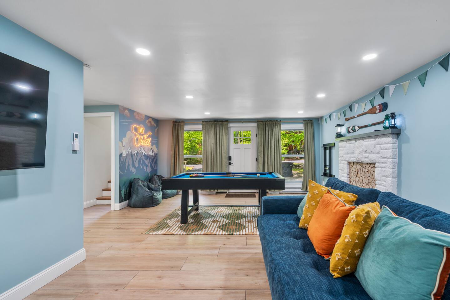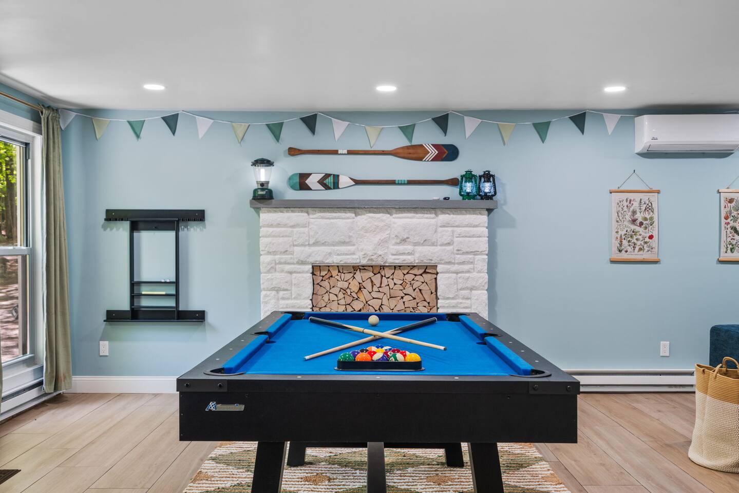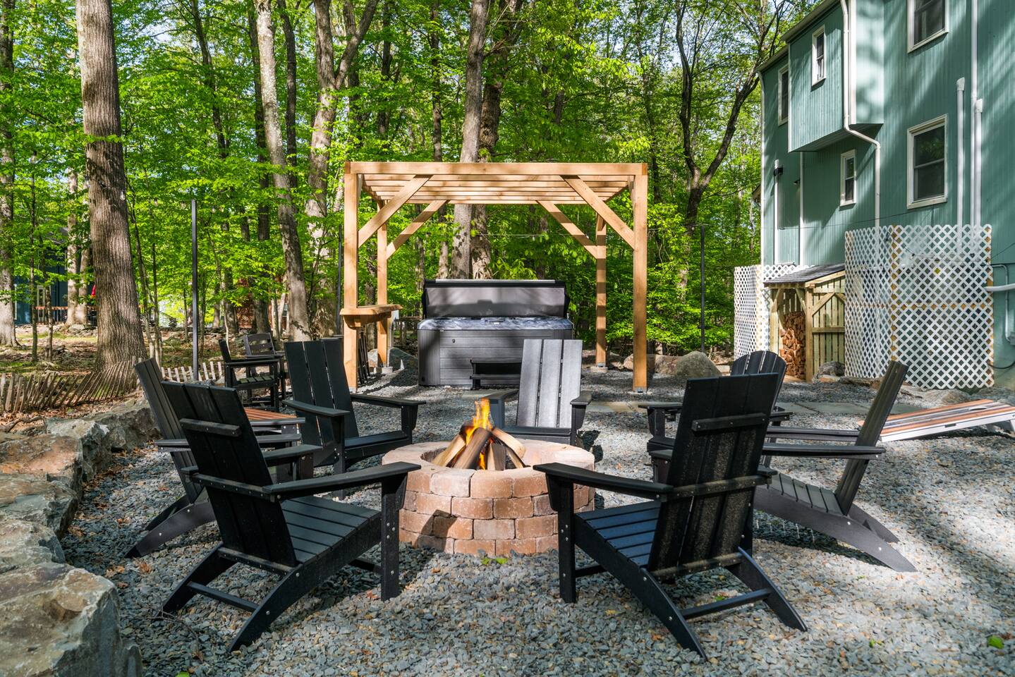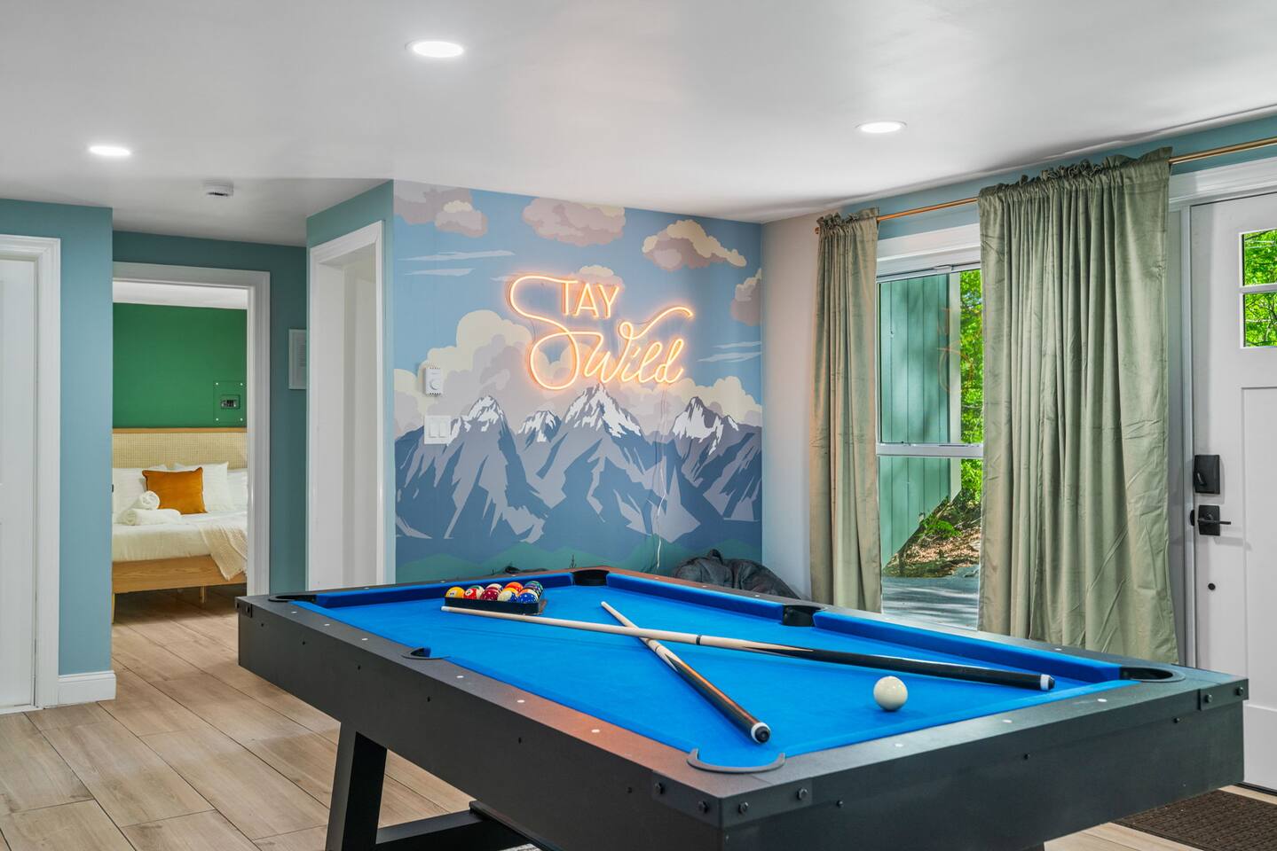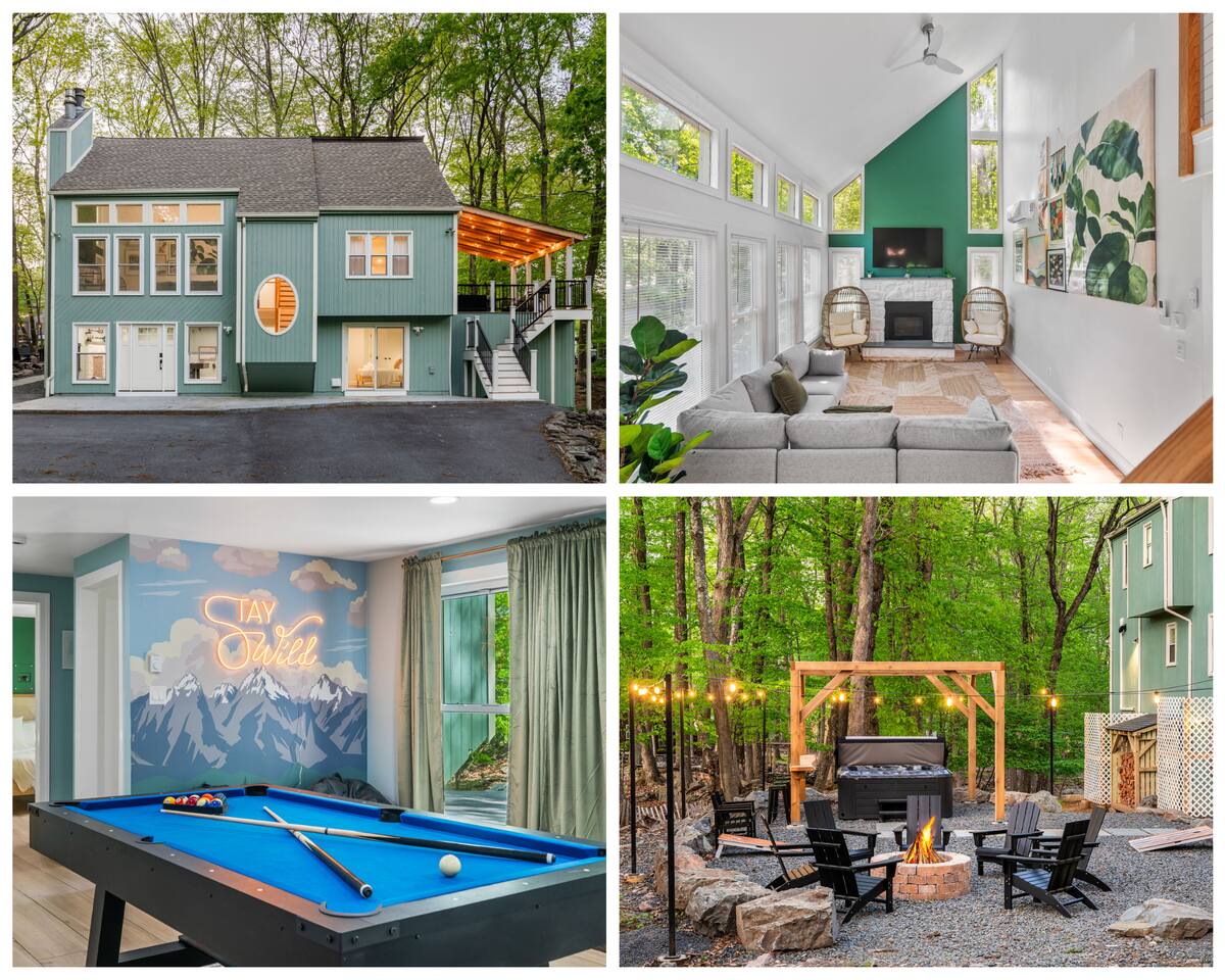 Get ready for unforgettable memories! Whether you're soaking in the hot tub under the stars, sharing stories around the firepit, or enjoying game nights and home-cooked meals, this home is made for laughter, connection, and relaxation. With space for everyone and something for all ages, your stay will be filled with fun, comfort, and the perfect mix of adventure and downtime. -15 min to Downtown East Stroudsburg -15 min to Camelback Ski Resort -15 min to Premium Outlets -18 min to closest winery -20 min to Delaware Water Gap -25 min to Kalahari Resorts -28 min to Shawnee Mountain KEY FEATURES: *Sleeps 12 guests, 4 bedrooms; 2 King, 1 Queen, 2 sets of bunk beds (each with twin and full) *3 Bathrooms *Dog Friendly *Modern and well-equipped kitchen *game room, pool table + arcade machine *covered outside lounge area *indoor gas fireplace *hot tub *fire pit **BEDROOMS** This spacious home offers four beautifully appointed bedrooms across three levels, each thoughtfully designed for comfort and relaxation. On the main floor, just off the game room, you'll find a cozy retreat with a queen bed, sliding glass doors to head outside and generous closet space, perfect for guests seeking a quiet corner to unwind. Upstairs, directly off the kitchen, a serene bedroom features a plush king-size bed and a large closet, offering a restful haven with easy access to the heart of the home. The top floor is ideal for families or larger groups. To the right, a fun-filled kids' room includes two sets of bunk beds—each with twin and full-size mattresses—creating the ultimate sleepover space. Across the hall, the final bedroom offers another luxurious king-size bed and a spacious closet, completing this home’s perfect blend of function, comfort, and style. **BATHROOMS** Each of the three bathrooms in this home has been thoughtfully designed with both style and comfort in mind. On the main level, near the game room, you’ll find a beautifully renovated full bathroom that exudes a spa-like ambiance, complete with a sleek walk-in shower, modern fixtures, and calming finishes—perfect for refreshing after a day of adventure. Up on the second floor, just off the kitchen, a vibrant bathroom features a walk-in shower and eye-catching patterned floor tile that adds a playful yet polished touch to the space. It’s as functional as it is stylish, offering easy access for guests on the main living level. The third-floor bathroom is ideal for families, featuring a spacious tub perfect for little ones or a relaxing soak, along with a double vanity set against a striking green tile accent wall. The thoughtful layout and bold yet elegant finishes make it a standout feature of the home, providing both beauty and convenience on every level. **LIVING ROOM, KITCHEN + DINING ROOM** As you ascend the stairs from the lower level, you’re welcomed into an open-concept main floor that effortlessly blends style, comfort, and functionality. Straight ahead, another staircase leads to the third floor, while to your left, the expansive living room draws you in with its soaring ceilings and walls of windows that flood the space with natural light. A sleek gas fireplace anchors the room, surrounded by a plush sectional and trendy egg chairs that invite you to relax and unwind. The space is artfully accented by a vibrant gallery wall that brings warmth and personality through a curated mix of color and creativity. To the right of the stairs, the flow continues into the newly renovated dining and kitchen areas. The dining room is a true gathering place, featuring a large wooden table with seating for ten—eight chairs and a long bench—ideal for shared meals and lively conversation. Just beyond, the modern kitchen is a dream for any cook, with beautiful green cabinetry, open shelving, and a spacious island perfect for prepping or casual bites. Thoughtfully stocked and fully equipped, it has everything needed to make meals feel effortless. Sliding glass doors open from both the dining and kitchen areas to a covered outdoor lounge space—an idyllic spot to sip your morning coffee, breathe in the fresh Poconos air, and soak in the peaceful surroundings. **GAME ROOM** Step into the home and you’re immediately greeted by the vibrant and inviting game room—a perfect kickoff to your getaway. This lively space is designed for fun and connection, featuring a full-size pool table at its center and a classic arcade game that adds a nostalgic touch. A cozy lounging area with a TV offers a great spot to unwind or watch the big game, while shelves stocked with board games ensure entertainment for all ages. The room’s standout feature is a striking mountain-inspired accent wall, complete with a glowing neon sign that reads “Stay Wild,” setting the tone for your stay with playful, adventurous energy. Just off this space, a separate laundry room with a washer and dryer adds extra convenience, especially for longer stays. Whether you're starting your day with a game of pool or winding down with a family movie night, this game room is your home’s ultimate hangout hub. **OUTDOOR AREA** Tucked along the side of the home, the outdoor area is a cozy, beautifully designed escape that invites you to relax and reconnect. At its heart is a firepit surrounded by comfortable seating—perfect for gathering with family and friends under the stars, toasting marshmallows, or sharing stories late into the night. Just steps away, a private hot tub awaits, offering room for up to six guests to soak, unwind, and take in the crisp mountain air. Please note towels are not supplied for the hot tub so please bring your own if you wish to use the hot tub. String lights are thoughtfully wrapped around the space, casting a soft glow that transforms the area into a magical retreat as the sun sets. Whether you're enjoying a peaceful morning coffee or ending the day with a soak and a glass of wine, this outdoor haven is designed for unforgettable moments in every s