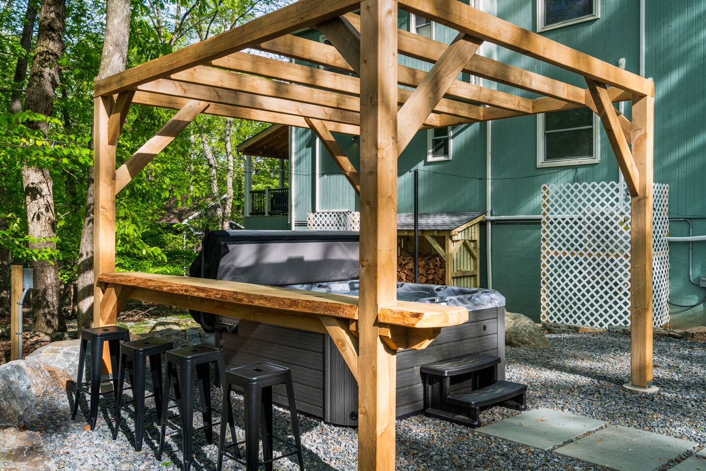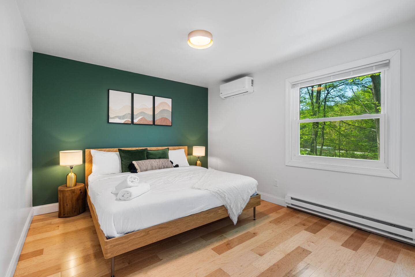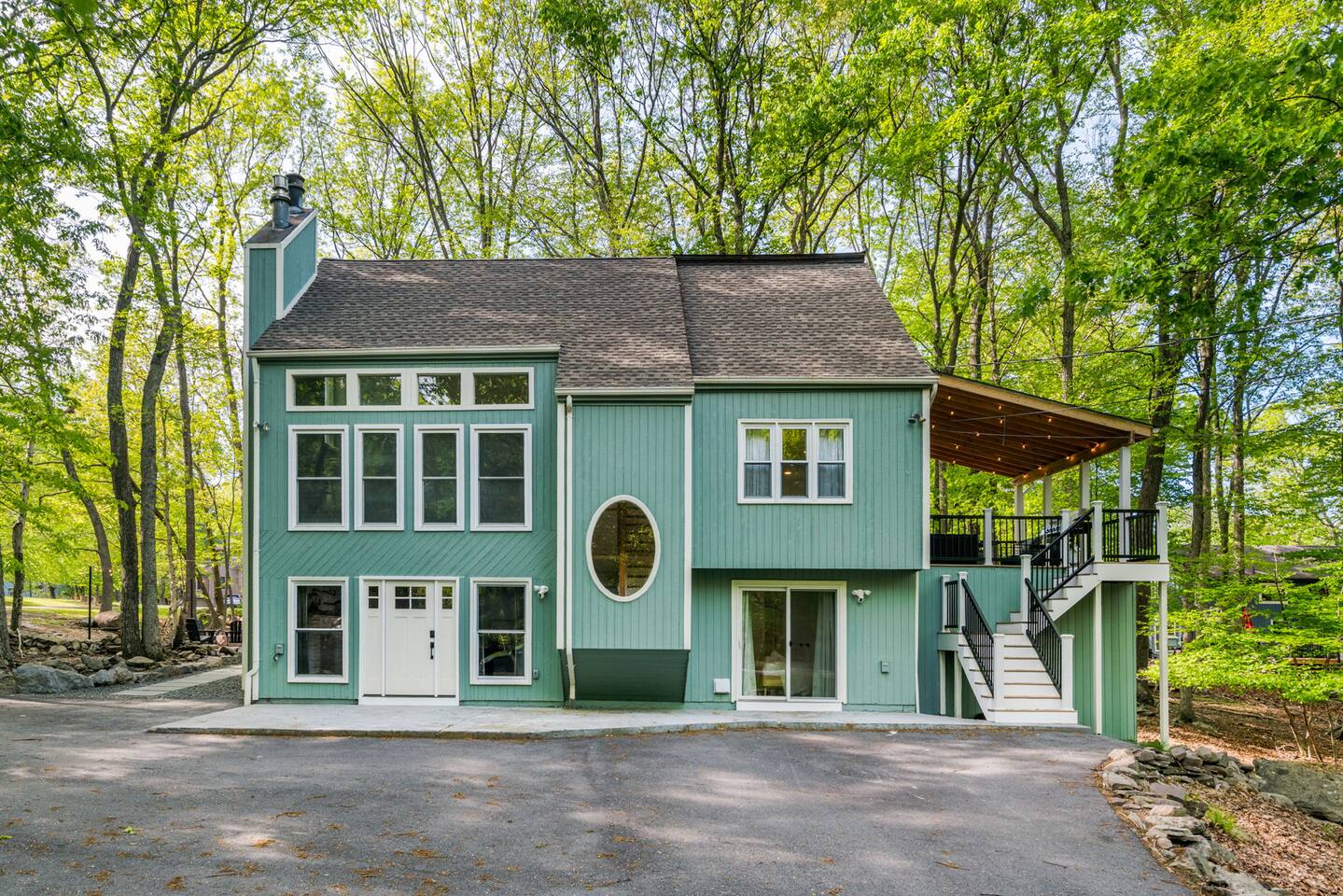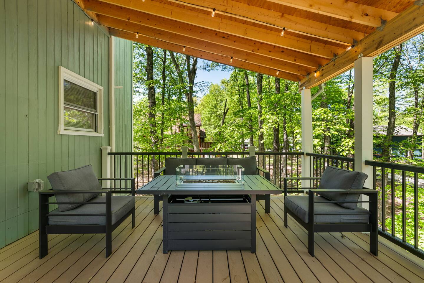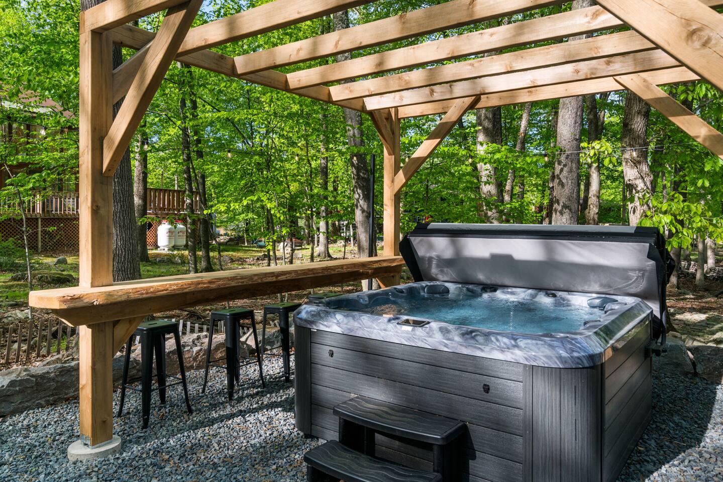 Get ready for unforgettable memories! Whether you're soaking in the hot tub under the stars, sharing stories around the firepit, or enjoying game nights and home-cooked meals, this home is made for laughter, connection, and relaxation. With space for everyone and something for all ages, your stay will be filled with fun, comfort, and the perfect mix of adventure and downtime. -15 min to Downtown East Stroudsburg -15 min to Camelback Ski Resort -15 min to Premium Outlets -18 min to closest winery -20 min to Delaware Water Gap -25 min to Kalahari Resorts -28 min to Shawnee Mountain KEY FEATURES: *Sleeps 12 guests, 4 bedrooms; 2 King, 1 Queen, 2 sets of bunk beds (each with twin and full) *3 Bathrooms *Dog Friendly *Modern and well-equipped kitchen *game room, pool table + arcade machine *covered outside lounge area *indoor gas fireplace *hot tub *fire pit **BEDROOMS** This spacious home offers four beautifully appointed bedrooms across three levels, each thoughtfully designed for comfort and relaxation. On the main floor, just off the game room, you'll find a cozy retreat with a queen bed, sliding glass doors to head outside and generous closet space, perfect for guests seeking a quiet corner to unwind. Upstairs, directly off the kitchen, a serene bedroom features a plush king-size bed and a large closet, offering a restful haven with easy access to the heart of the home. The top floor is ideal for families or larger groups. To the right, a fun-filled kids' room includes two sets of bunk beds—each with twin and full-size mattresses—creating the ultimate sleepover space. Across the hall, the final bedroom offers another luxurious king-size bed and a spacious closet, completing this home’s perfect blend of function, comfort, and style. **BATHROOMS** Each of the three bathrooms in this home has been thoughtfully designed with both style and comfort in mind. On the main level, near the game room, you’ll find a beautifully renovated full bathroom that exudes a spa-like ambiance, complete with a sleek walk-in shower, modern fixtures, and calming finishes—perfect for refreshing after a day of adventure. Up on the second floor, just off the kitchen, a vibrant bathroom features a walk-in shower and eye-catching patterned floor tile that adds a playful yet polished touch to the space. It’s as functional as it is stylish, offering easy access for guests on the main living level. The third-floor bathroom is ideal for families, featuring a spacious tub perfect for little ones or a relaxing soak, along with a double vanity set against a striking green tile accent wall. The thoughtful layout and bold yet elegant finishes make it a standout feature of the home, providing both beauty and convenience on every level. **LIVING ROOM, KITCHEN + DINING ROOM** As you ascend the stairs from the lower level, you’re welcomed into an open-concept main floor that effortlessly blends style, comfort, and functionality. Straight ahead, another staircase leads to the third floor, while to your left, the expansive living room draws you in with its soaring ceilings and walls of windows that flood the space with natural light. A sleek gas fireplace anchors the room, surrounded by a plush sectional and trendy egg chairs that invite you to relax and unwind. The space is artfully accented by a vibrant gallery wall that brings warmth and personality through a curated mix of color and creativity. To the right of the stairs, the flow continues into the newly renovated dining and kitchen areas. The dining room is a true gathering place, featuring a large wooden table with seating for ten—eight chairs and a long bench—ideal for shared meals and lively conversation. Just beyond, the modern kitchen is a dream for any cook, with beautiful green cabinetry, open shelving, and a spacious island perfect for prepping or casual bites. Thoughtfully stocked and fully equipped, it has everything needed to make meals feel effortless. Sliding glass doors open from both the dining and kitchen areas to a covered outdoor lounge space—an idyllic spot to sip your morning coffee, breathe in the fresh Poconos air, and soak in the peaceful surroundings. **GAME ROOM** Step into the home and you’re immediately greeted by the vibrant and inviting game room—a perfect kickoff to your getaway. This lively space is designed for fun and connection, featuring a full-size pool table at its center and a classic arcade game that adds a nostalgic touch. A cozy lounging area with a TV offers a great spot to unwind or watch the big game, while shelves stocked with board games ensure entertainment for all ages. The room’s standout feature is a striking mountain-inspired accent wall, complete with a glowing neon sign that reads “Stay Wild,” setting the tone for your stay with playful, adventurous energy. Just off this space, a separate laundry room with a washer and dryer adds extra convenience, especially for longer stays. Whether you're starting your day with a game of pool or winding down with a family movie night, this game room is your home’s ultimate hangout hub. **OUTDOOR AREA** Tucked along the side of the home, the outdoor area is a cozy, beautifully designed escape that invites you to relax and reconnect. At its heart is a firepit surrounded by comfortable seating—perfect for gathering with family and friends under the stars, toasting marshmallows, or sharing stories late into the night. Just steps away, a private hot tub awaits, offering room for up to six guests to soak, unwind, and take in the crisp mountain air. Please note towels are not supplied for the hot tub so please bring your own if you wish to use the hot tub. String lights are thoughtfully wrapped around the space, casting a soft glow that transforms the area into a magical retreat as the sun sets. Whether you're enjoying a peaceful morning coffee or ending the day with a soak and a glass of wine, this outdoor haven is designed for unforgettable moments in every s