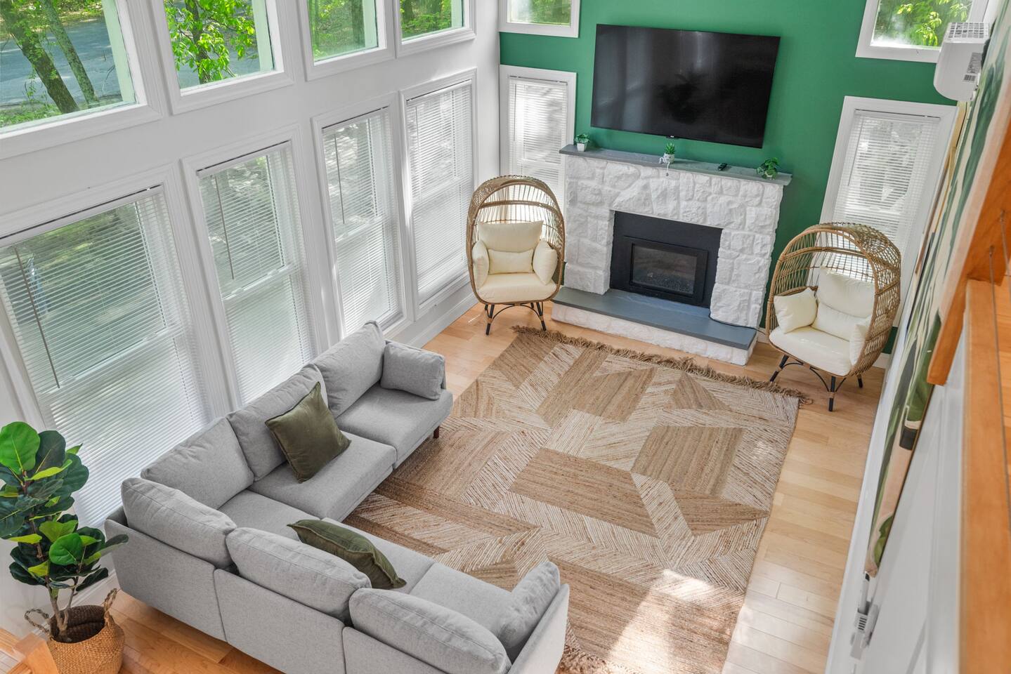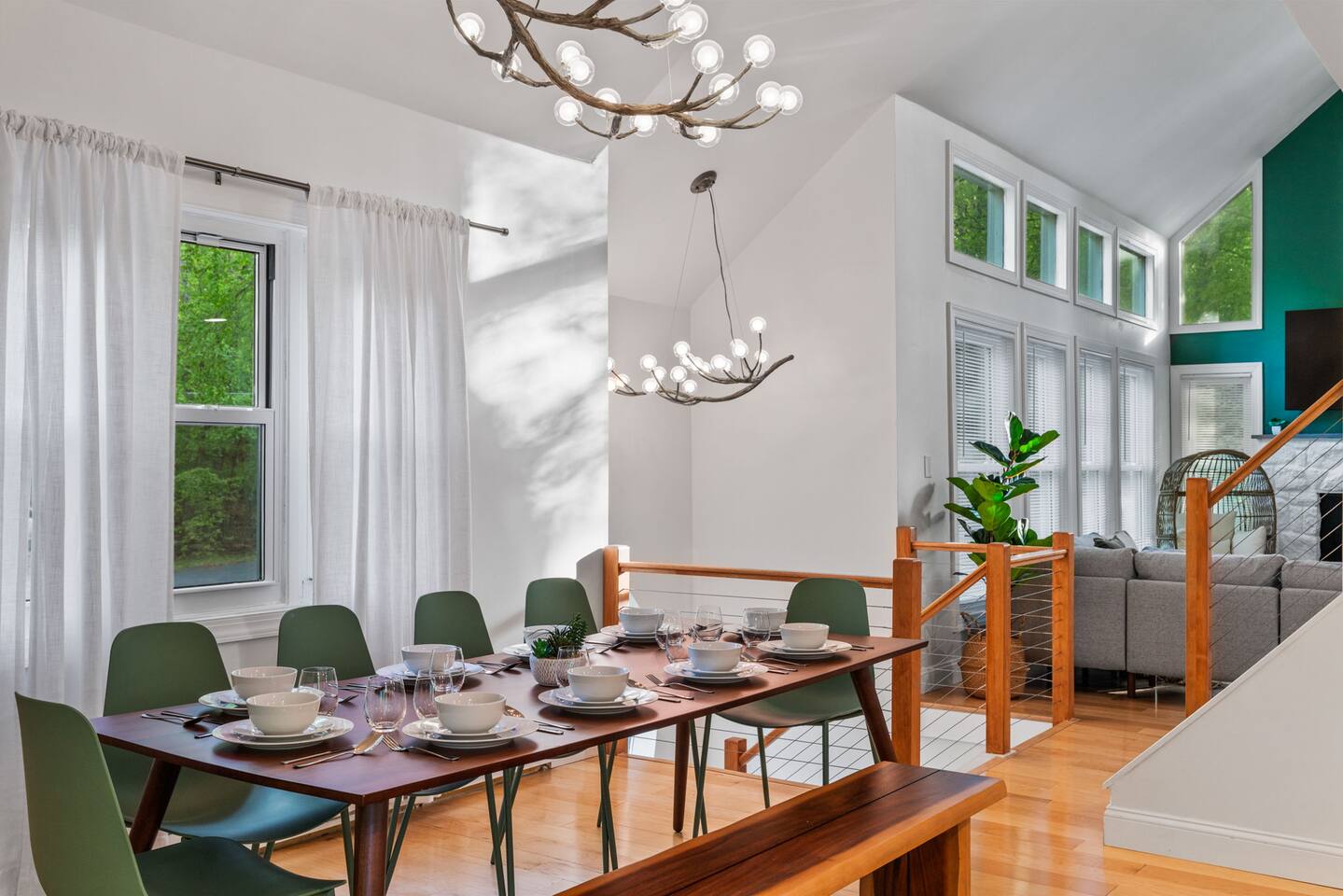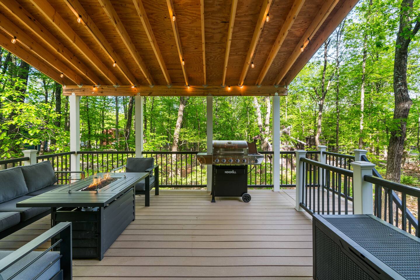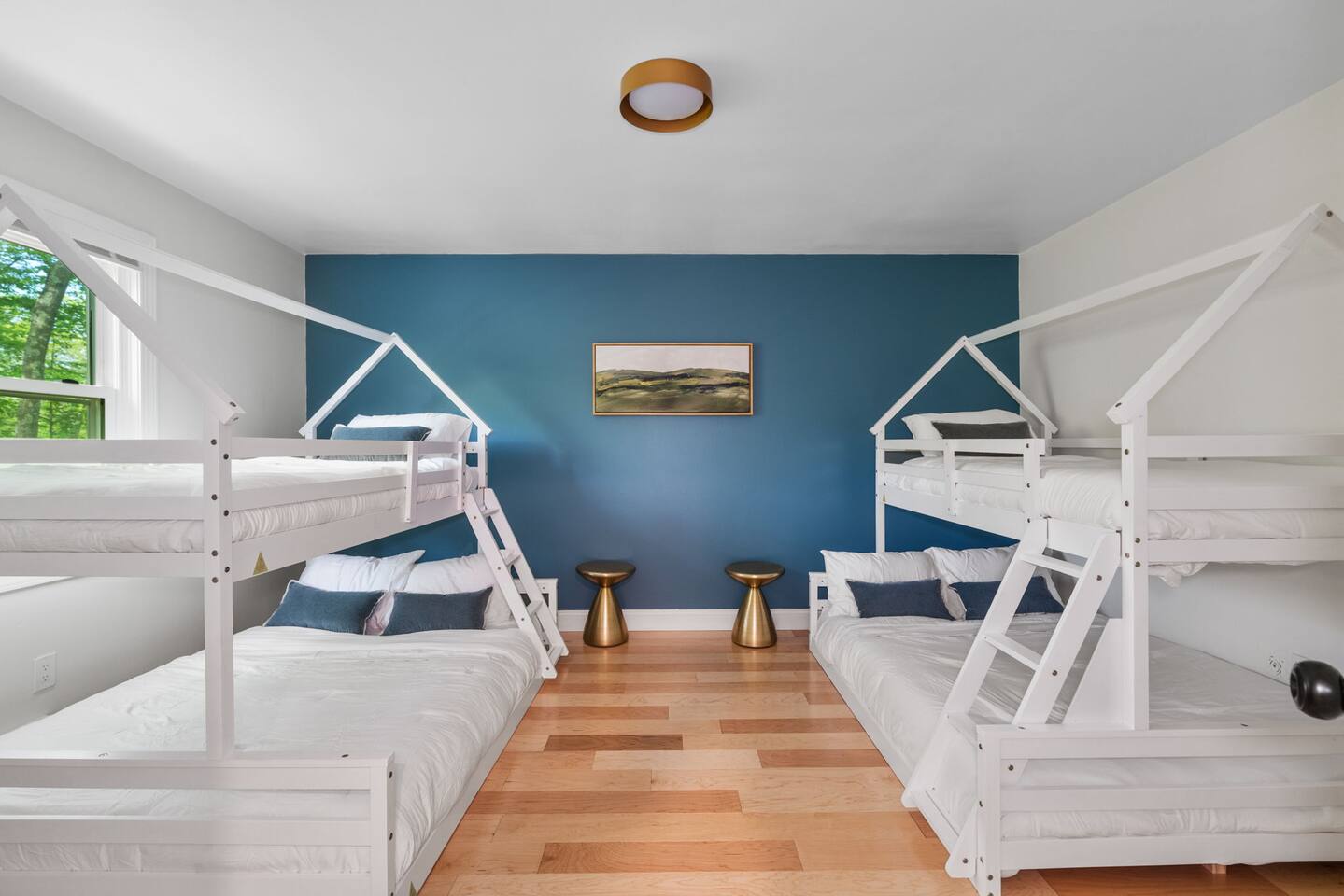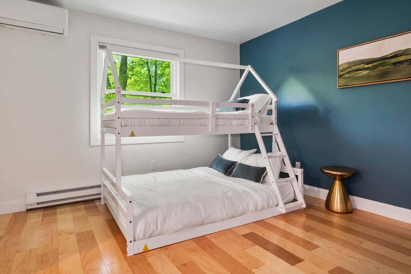 Get ready for unforgettable memories! Whether you're soaking in the hot tub under the stars, sharing stories around the firepit, or enjoying game nights and home-cooked meals, this home is made for laughter, connection, and relaxation. With space for everyone and something for all ages, your stay will be filled with fun, comfort, and the perfect mix of adventure and downtime. -15 min to Downtown East Stroudsburg -15 min to Camelback Ski Resort -15 min to Premium Outlets -18 min to closest winery -20 min to Delaware Water Gap -25 min to Kalahari Resorts -28 min to Shawnee Mountain KEY FEATURES: *Sleeps 12 guests, 4 bedrooms; 2 King, 1 Queen, 2 sets of bunk beds (each with twin and full) *3 Bathrooms *Dog Friendly *Modern and well-equipped kitchen *game room, pool table + arcade machine *covered outside lounge area *indoor gas fireplace *hot tub *fire pit **BEDROOMS** This spacious home offers four beautifully appointed bedrooms across three levels, each thoughtfully designed for comfort and relaxation. On the main floor, just off the game room, you'll find a cozy retreat with a queen bed, sliding glass doors to head outside and generous closet space, perfect for guests seeking a quiet corner to unwind. Upstairs, directly off the kitchen, a serene bedroom features a plush king-size bed and a large closet, offering a restful haven with easy access to the heart of the home. The top floor is ideal for families or larger groups. To the right, a fun-filled kids' room includes two sets of bunk beds—each with twin and full-size mattresses—creating the ultimate sleepover space. Across the hall, the final bedroom offers another luxurious king-size bed and a spacious closet, completing this home’s perfect blend of function, comfort, and style. **BATHROOMS** Each of the three bathrooms in this home has been thoughtfully designed with both style and comfort in mind. On the main level, near the game room, you’ll find a beautifully renovated full bathroom that exudes a spa-like ambiance, complete with a sleek walk-in shower, modern fixtures, and calming finishes—perfect for refreshing after a day of adventure. Up on the second floor, just off the kitchen, a vibrant bathroom features a walk-in shower and eye-catching patterned floor tile that adds a playful yet polished touch to the space. It’s as functional as it is stylish, offering easy access for guests on the main living level. The third-floor bathroom is ideal for families, featuring a spacious tub perfect for little ones or a relaxing soak, along with a double vanity set against a striking green tile accent wall. The thoughtful layout and bold yet elegant finishes make it a standout feature of the home, providing both beauty and convenience on every level. **LIVING ROOM, KITCHEN + DINING ROOM** As you ascend the stairs from the lower level, you’re welcomed into an open-concept main floor that effortlessly blends style, comfort, and functionality. Straight ahead, another staircase leads to the third floor, while to your left, the expansive living room draws you in with its soaring ceilings and walls of windows that flood the space with natural light. A sleek gas fireplace anchors the room, surrounded by a plush sectional and trendy egg chairs that invite you to relax and unwind. The space is artfully accented by a vibrant gallery wall that brings warmth and personality through a curated mix of color and creativity. To the right of the stairs, the flow continues into the newly renovated dining and kitchen areas. The dining room is a true gathering place, featuring a large wooden table with seating for ten—eight chairs and a long bench—ideal for shared meals and lively conversation. Just beyond, the modern kitchen is a dream for any cook, with beautiful green cabinetry, open shelving, and a spacious island perfect for prepping or casual bites. Thoughtfully stocked and fully equipped, it has everything needed to make meals feel effortless. Sliding glass doors open from both the dining and kitchen areas to a covered outdoor lounge space—an idyllic spot to sip your morning coffee, breathe in the fresh Poconos air, and soak in the peaceful surroundings. **GAME ROOM** Step into the home and you’re immediately greeted by the vibrant and inviting game room—a perfect kickoff to your getaway. This lively space is designed for fun and connection, featuring a full-size pool table at its center and a classic arcade game that adds a nostalgic touch. A cozy lounging area with a TV offers a great spot to unwind or watch the big game, while shelves stocked with board games ensure entertainment for all ages. The room’s standout feature is a striking mountain-inspired accent wall, complete with a glowing neon sign that reads “Stay Wild,” setting the tone for your stay with playful, adventurous energy. Just off this space, a separate laundry room with a washer and dryer adds extra convenience, especially for longer stays. Whether you're starting your day with a game of pool or winding down with a family movie night, this game room is your home’s ultimate hangout hub. **OUTDOOR AREA** Tucked along the side of the home, the outdoor area is a cozy, beautifully designed escape that invites you to relax and reconnect. At its heart is a firepit surrounded by comfortable seating—perfect for gathering with family and friends under the stars, toasting marshmallows, or sharing stories late into the night. Just steps away, a private hot tub awaits, offering room for up to six guests to soak, unwind, and take in the crisp mountain air. Please note towels are not supplied for the hot tub so please bring your own if you wish to use the hot tub. String lights are thoughtfully wrapped around the space, casting a soft glow that transforms the area into a magical retreat as the sun sets. Whether you're enjoying a peaceful morning coffee or ending the day with a soak and a glass of wine, this outdoor haven is designed for unforgettable moments in every s