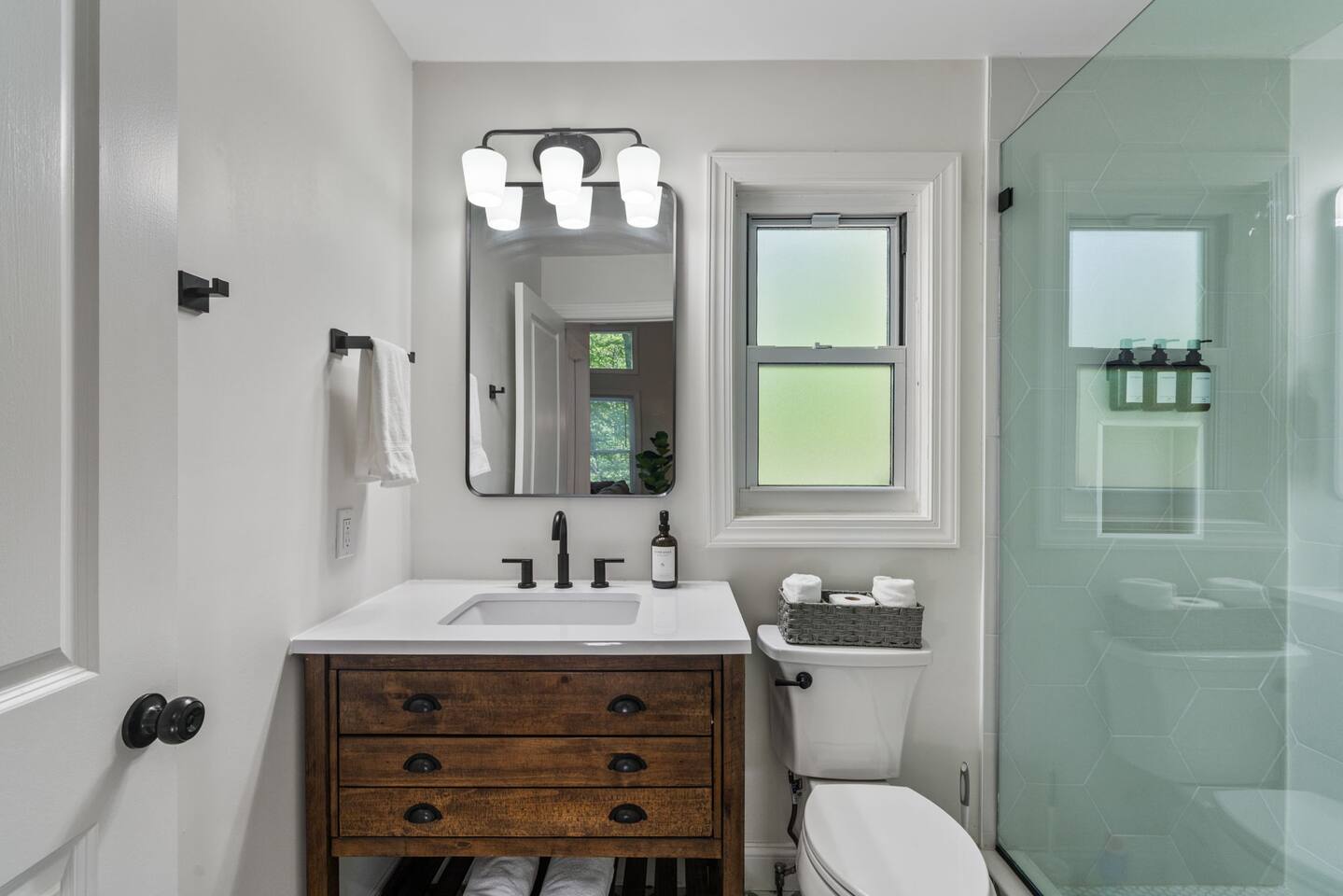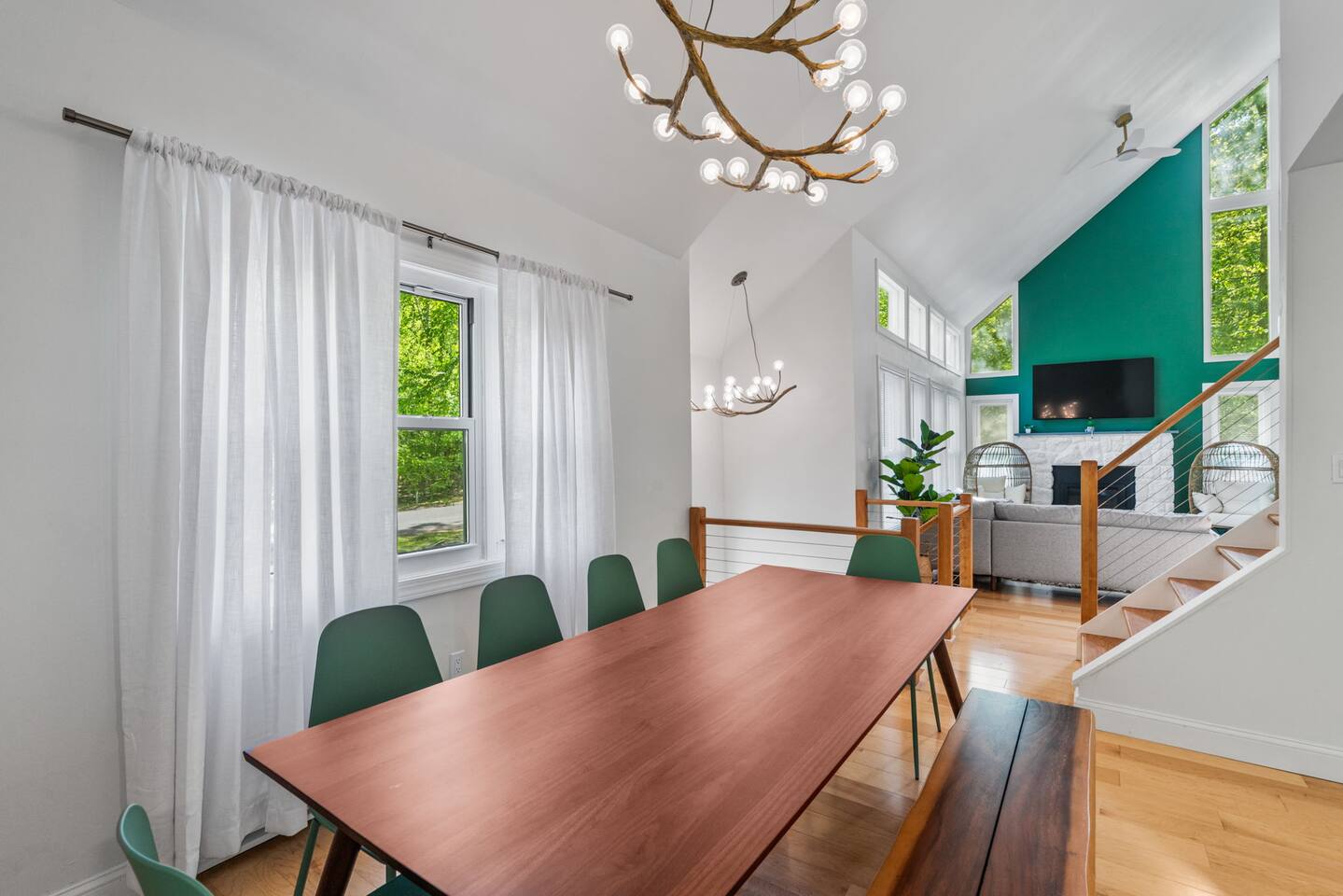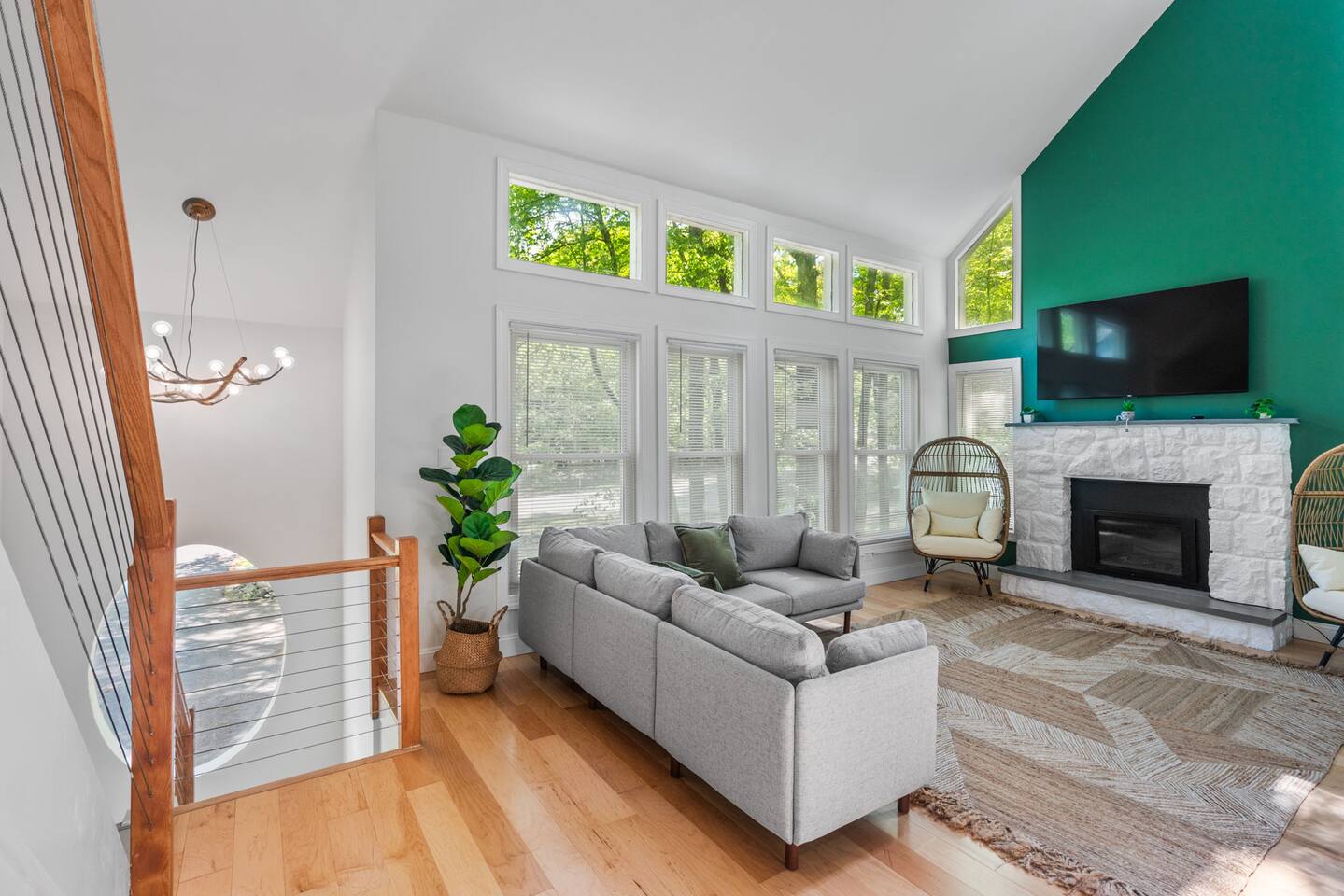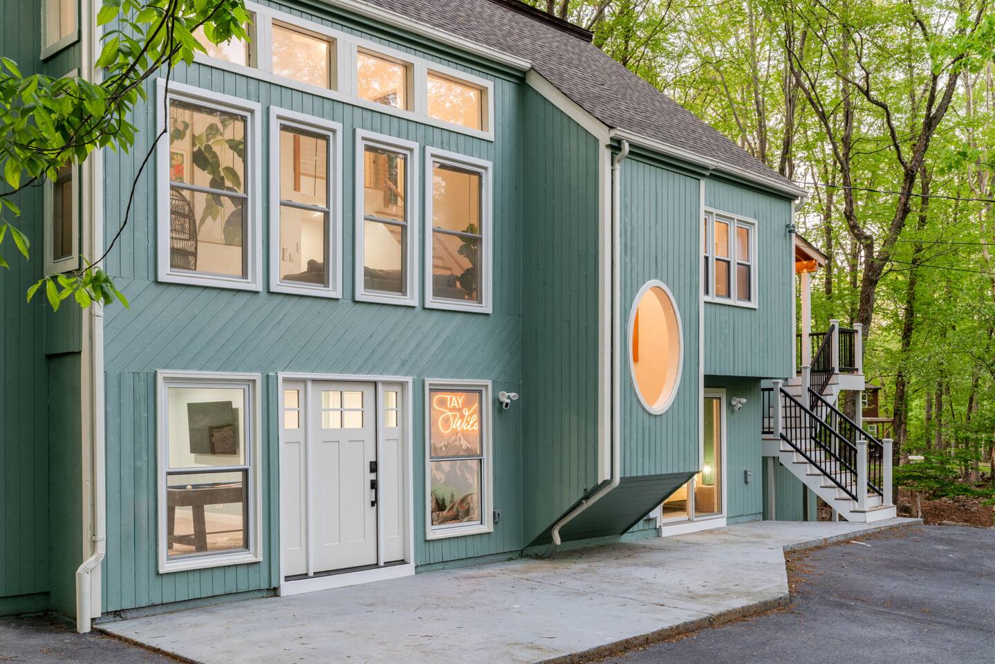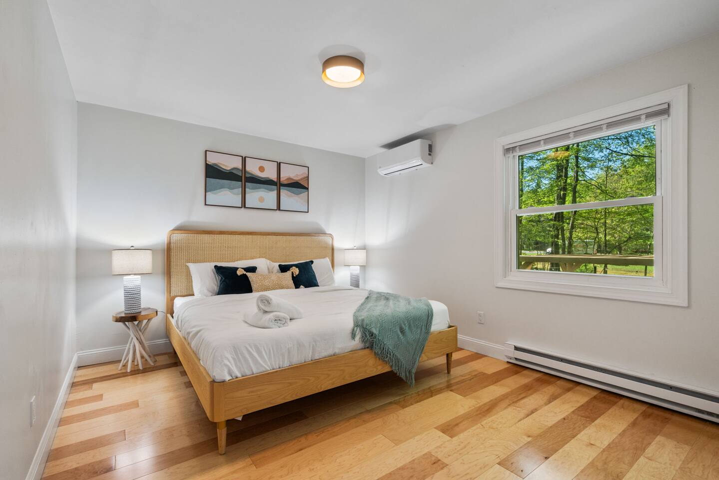 Get ready for unforgettable memories! Whether you're soaking in the hot tub under the stars, sharing stories around the firepit, or enjoying game nights and home-cooked meals, this home is made for laughter, connection, and relaxation. With space for everyone and something for all ages, your stay will be filled with fun, comfort, and the perfect mix of adventure and downtime. -15 min to Downtown East Stroudsburg -15 min to Camelback Ski Resort -15 min to Premium Outlets -18 min to closest winery -20 min to Delaware Water Gap -25 min to Kalahari Resorts -28 min to Shawnee Mountain KEY FEATURES: *Sleeps 12 guests, 4 bedrooms; 2 King, 1 Queen, 2 sets of bunk beds (each with twin and full) *3 Bathrooms *Dog Friendly *Modern and well-equipped kitchen *game room, pool table + arcade machine *covered outside lounge area *indoor gas fireplace *hot tub *fire pit **BEDROOMS** This spacious home offers four beautifully appointed bedrooms across three levels, each thoughtfully designed for comfort and relaxation. On the main floor, just off the game room, you'll find a cozy retreat with a queen bed, sliding glass doors to head outside and generous closet space, perfect for guests seeking a quiet corner to unwind. Upstairs, directly off the kitchen, a serene bedroom features a plush king-size bed and a large closet, offering a restful haven with easy access to the heart of the home. The top floor is ideal for families or larger groups. To the right, a fun-filled kids' room includes two sets of bunk beds—each with twin and full-size mattresses—creating the ultimate sleepover space. Across the hall, the final bedroom offers another luxurious king-size bed and a spacious closet, completing this home’s perfect blend of function, comfort, and style. **BATHROOMS** Each of the three bathrooms in this home has been thoughtfully designed with both style and comfort in mind. On the main level, near the game room, you’ll find a beautifully renovated full bathroom that exudes a spa-like ambiance, complete with a sleek walk-in shower, modern fixtures, and calming finishes—perfect for refreshing after a day of adventure. Up on the second floor, just off the kitchen, a vibrant bathroom features a walk-in shower and eye-catching patterned floor tile that adds a playful yet polished touch to the space. It’s as functional as it is stylish, offering easy access for guests on the main living level. The third-floor bathroom is ideal for families, featuring a spacious tub perfect for little ones or a relaxing soak, along with a double vanity set against a striking green tile accent wall. The thoughtful layout and bold yet elegant finishes make it a standout feature of the home, providing both beauty and convenience on every level. **LIVING ROOM, KITCHEN + DINING ROOM** As you ascend the stairs from the lower level, you’re welcomed into an open-concept main floor that effortlessly blends style, comfort, and functionality. Straight ahead, another staircase leads to the third floor, while to your left, the expansive living room draws you in with its soaring ceilings and walls of windows that flood the space with natural light. A sleek gas fireplace anchors the room, surrounded by a plush sectional and trendy egg chairs that invite you to relax and unwind. The space is artfully accented by a vibrant gallery wall that brings warmth and personality through a curated mix of color and creativity. To the right of the stairs, the flow continues into the newly renovated dining and kitchen areas. The dining room is a true gathering place, featuring a large wooden table with seating for ten—eight chairs and a long bench—ideal for shared meals and lively conversation. Just beyond, the modern kitchen is a dream for any cook, with beautiful green cabinetry, open shelving, and a spacious island perfect for prepping or casual bites. Thoughtfully stocked and fully equipped, it has everything needed to make meals feel effortless. Sliding glass doors open from both the dining and kitchen areas to a covered outdoor lounge space—an idyllic spot to sip your morning coffee, breathe in the fresh Poconos air, and soak in the peaceful surroundings. **GAME ROOM** Step into the home and you’re immediately greeted by the vibrant and inviting game room—a perfect kickoff to your getaway. This lively space is designed for fun and connection, featuring a full-size pool table at its center and a classic arcade game that adds a nostalgic touch. A cozy lounging area with a TV offers a great spot to unwind or watch the big game, while shelves stocked with board games ensure entertainment for all ages. The room’s standout feature is a striking mountain-inspired accent wall, complete with a glowing neon sign that reads “Stay Wild,” setting the tone for your stay with playful, adventurous energy. Just off this space, a separate laundry room with a washer and dryer adds extra convenience, especially for longer stays. Whether you're starting your day with a game of pool or winding down with a family movie night, this game room is your home’s ultimate hangout hub. **OUTDOOR AREA** Tucked along the side of the home, the outdoor area is a cozy, beautifully designed escape that invites you to relax and reconnect. At its heart is a firepit surrounded by comfortable seating—perfect for gathering with family and friends under the stars, toasting marshmallows, or sharing stories late into the night. Just steps away, a private hot tub awaits, offering room for up to six guests to soak, unwind, and take in the crisp mountain air. Please note towels are not supplied for the hot tub so please bring your own if you wish to use the hot tub. String lights are thoughtfully wrapped around the space, casting a soft glow that transforms the area into a magical retreat as the sun sets. Whether you're enjoying a peaceful morning coffee or ending the day with a soak and a glass of wine, this outdoor haven is designed for unforgettable moments in every s