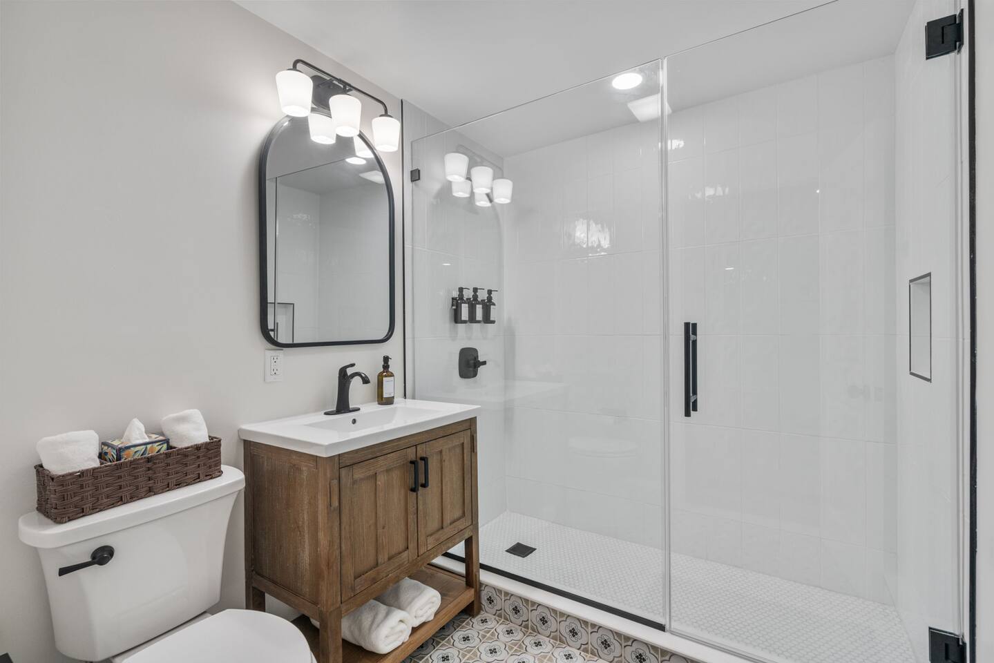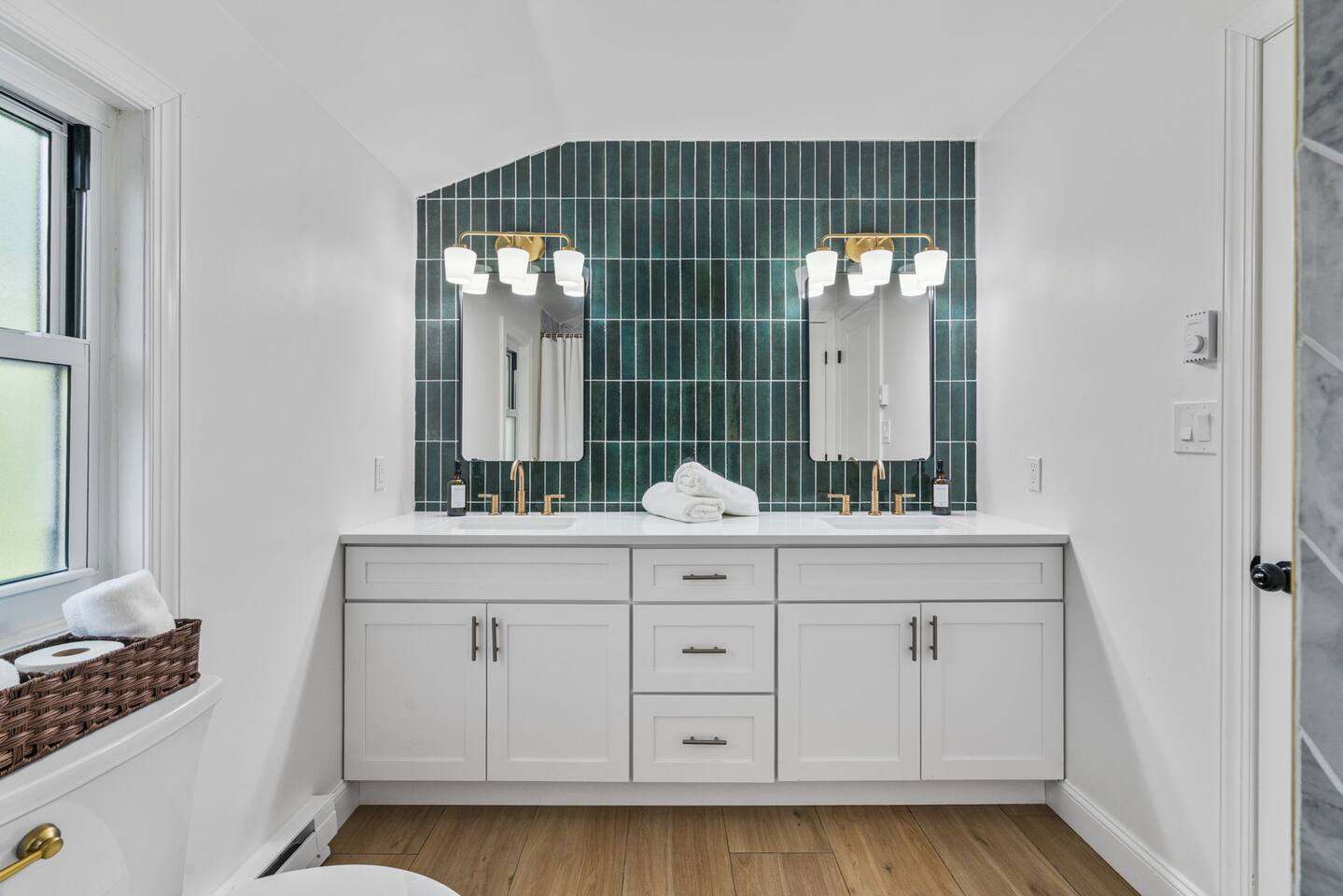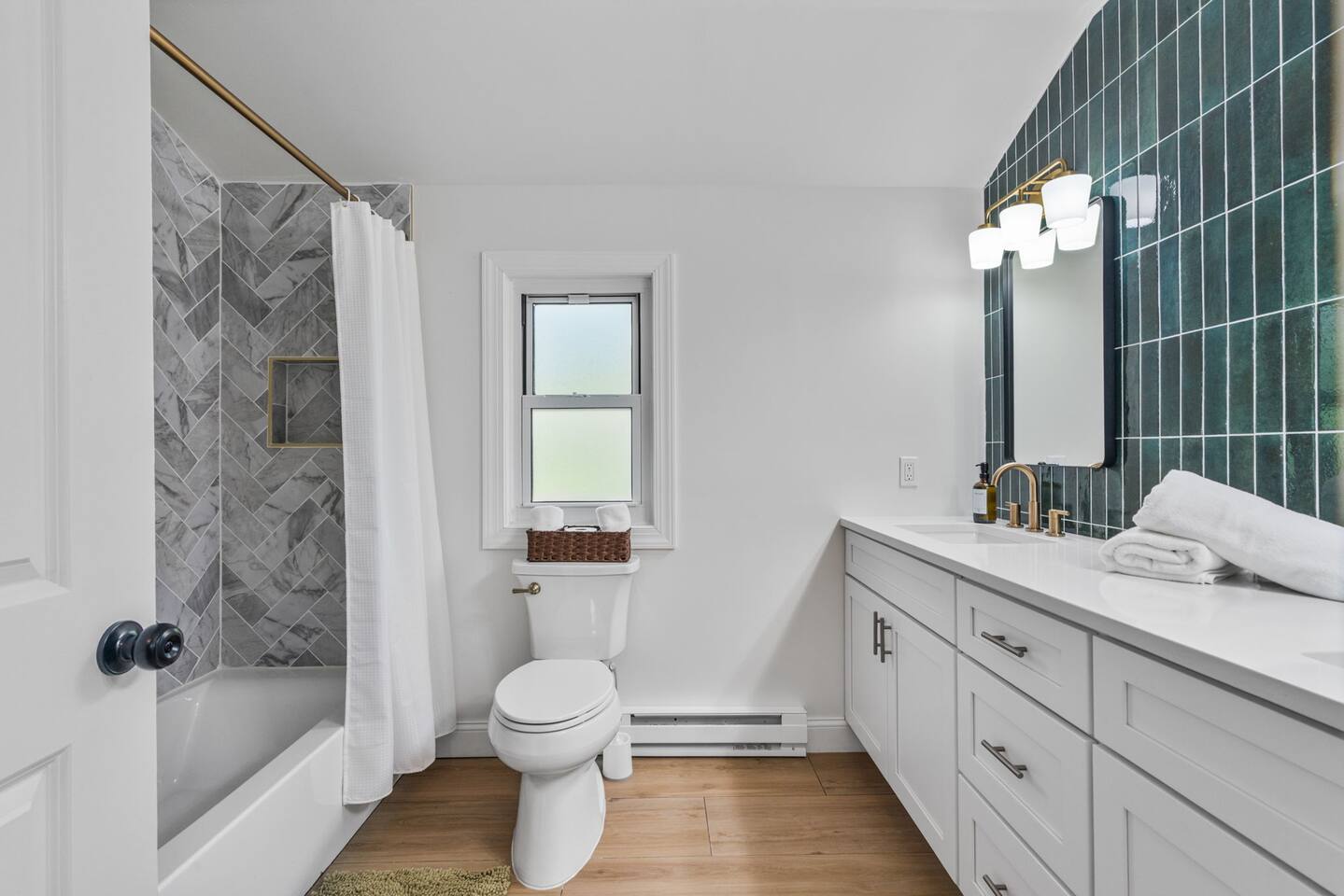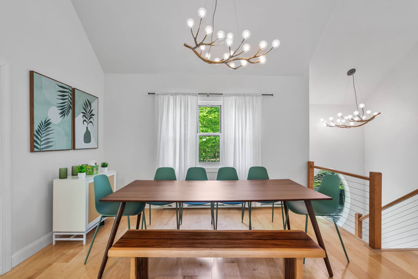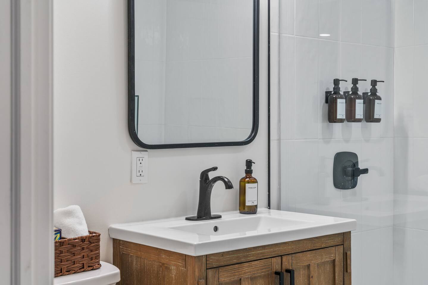 Get ready for unforgettable memories! Whether you're soaking in the hot tub under the stars, sharing stories around the firepit, or enjoying game nights and home-cooked meals, this home is made for laughter, connection, and relaxation. With space for everyone and something for all ages, your stay will be filled with fun, comfort, and the perfect mix of adventure and downtime. -15 min to Downtown East Stroudsburg -15 min to Camelback Ski Resort -15 min to Premium Outlets -18 min to closest winery -20 min to Delaware Water Gap -25 min to Kalahari Resorts -28 min to Shawnee Mountain KEY FEATURES: *Sleeps 12 guests, 4 bedrooms; 2 King, 1 Queen, 2 sets of bunk beds (each with twin and full) *3 Bathrooms *Dog Friendly *Modern and well-equipped kitchen *game room, pool table + arcade machine *covered outside lounge area *indoor gas fireplace *hot tub *fire pit **BEDROOMS** This spacious home offers four beautifully appointed bedrooms across three levels, each thoughtfully designed for comfort and relaxation. On the main floor, just off the game room, you'll find a cozy retreat with a queen bed, sliding glass doors to head outside and generous closet space, perfect for guests seeking a quiet corner to unwind. Upstairs, directly off the kitchen, a serene bedroom features a plush king-size bed and a large closet, offering a restful haven with easy access to the heart of the home. The top floor is ideal for families or larger groups. To the right, a fun-filled kids' room includes two sets of bunk beds—each with twin and full-size mattresses—creating the ultimate sleepover space. Across the hall, the final bedroom offers another luxurious king-size bed and a spacious closet, completing this home’s perfect blend of function, comfort, and style. **BATHROOMS** Each of the three bathrooms in this home has been thoughtfully designed with both style and comfort in mind. On the main level, near the game room, you’ll find a beautifully renovated full bathroom that exudes a spa-like ambiance, complete with a sleek walk-in shower, modern fixtures, and calming finishes—perfect for refreshing after a day of adventure. Up on the second floor, just off the kitchen, a vibrant bathroom features a walk-in shower and eye-catching patterned floor tile that adds a playful yet polished touch to the space. It’s as functional as it is stylish, offering easy access for guests on the main living level. The third-floor bathroom is ideal for families, featuring a spacious tub perfect for little ones or a relaxing soak, along with a double vanity set against a striking green tile accent wall. The thoughtful layout and bold yet elegant finishes make it a standout feature of the home, providing both beauty and convenience on every level. **LIVING ROOM, KITCHEN + DINING ROOM** As you ascend the stairs from the lower level, you’re welcomed into an open-concept main floor that effortlessly blends style, comfort, and functionality. Straight ahead, another staircase leads to the third floor, while to your left, the expansive living room draws you in with its soaring ceilings and walls of windows that flood the space with natural light. A sleek gas fireplace anchors the room, surrounded by a plush sectional and trendy egg chairs that invite you to relax and unwind. The space is artfully accented by a vibrant gallery wall that brings warmth and personality through a curated mix of color and creativity. To the right of the stairs, the flow continues into the newly renovated dining and kitchen areas. The dining room is a true gathering place, featuring a large wooden table with seating for ten—eight chairs and a long bench—ideal for shared meals and lively conversation. Just beyond, the modern kitchen is a dream for any cook, with beautiful green cabinetry, open shelving, and a spacious island perfect for prepping or casual bites. Thoughtfully stocked and fully equipped, it has everything needed to make meals feel effortless. Sliding glass doors open from both the dining and kitchen areas to a covered outdoor lounge space—an idyllic spot to sip your morning coffee, breathe in the fresh Poconos air, and soak in the peaceful surroundings. **GAME ROOM** Step into the home and you’re immediately greeted by the vibrant and inviting game room—a perfect kickoff to your getaway. This lively space is designed for fun and connection, featuring a full-size pool table at its center and a classic arcade game that adds a nostalgic touch. A cozy lounging area with a TV offers a great spot to unwind or watch the big game, while shelves stocked with board games ensure entertainment for all ages. The room’s standout feature is a striking mountain-inspired accent wall, complete with a glowing neon sign that reads “Stay Wild,” setting the tone for your stay with playful, adventurous energy. Just off this space, a separate laundry room with a washer and dryer adds extra convenience, especially for longer stays. Whether you're starting your day with a game of pool or winding down with a family movie night, this game room is your home’s ultimate hangout hub. **OUTDOOR AREA** Tucked along the side of the home, the outdoor area is a cozy, beautifully designed escape that invites you to relax and reconnect. At its heart is a firepit surrounded by comfortable seating—perfect for gathering with family and friends under the stars, toasting marshmallows, or sharing stories late into the night. Just steps away, a private hot tub awaits, offering room for up to six guests to soak, unwind, and take in the crisp mountain air. Please note towels are not supplied for the hot tub so please bring your own if you wish to use the hot tub. String lights are thoughtfully wrapped around the space, casting a soft glow that transforms the area into a magical retreat as the sun sets. Whether you're enjoying a peaceful morning coffee or ending the day with a soak and a glass of wine, this outdoor haven is designed for unforgettable moments in every s