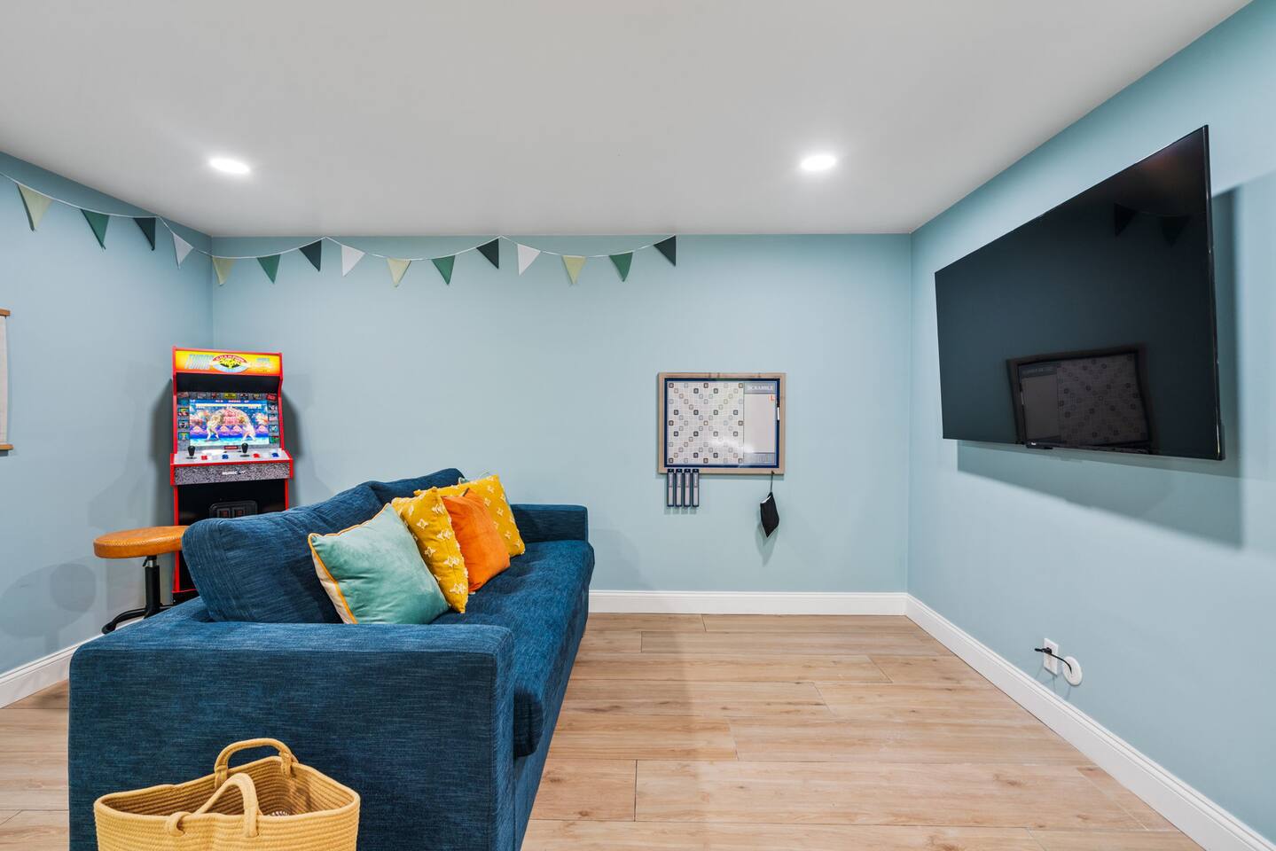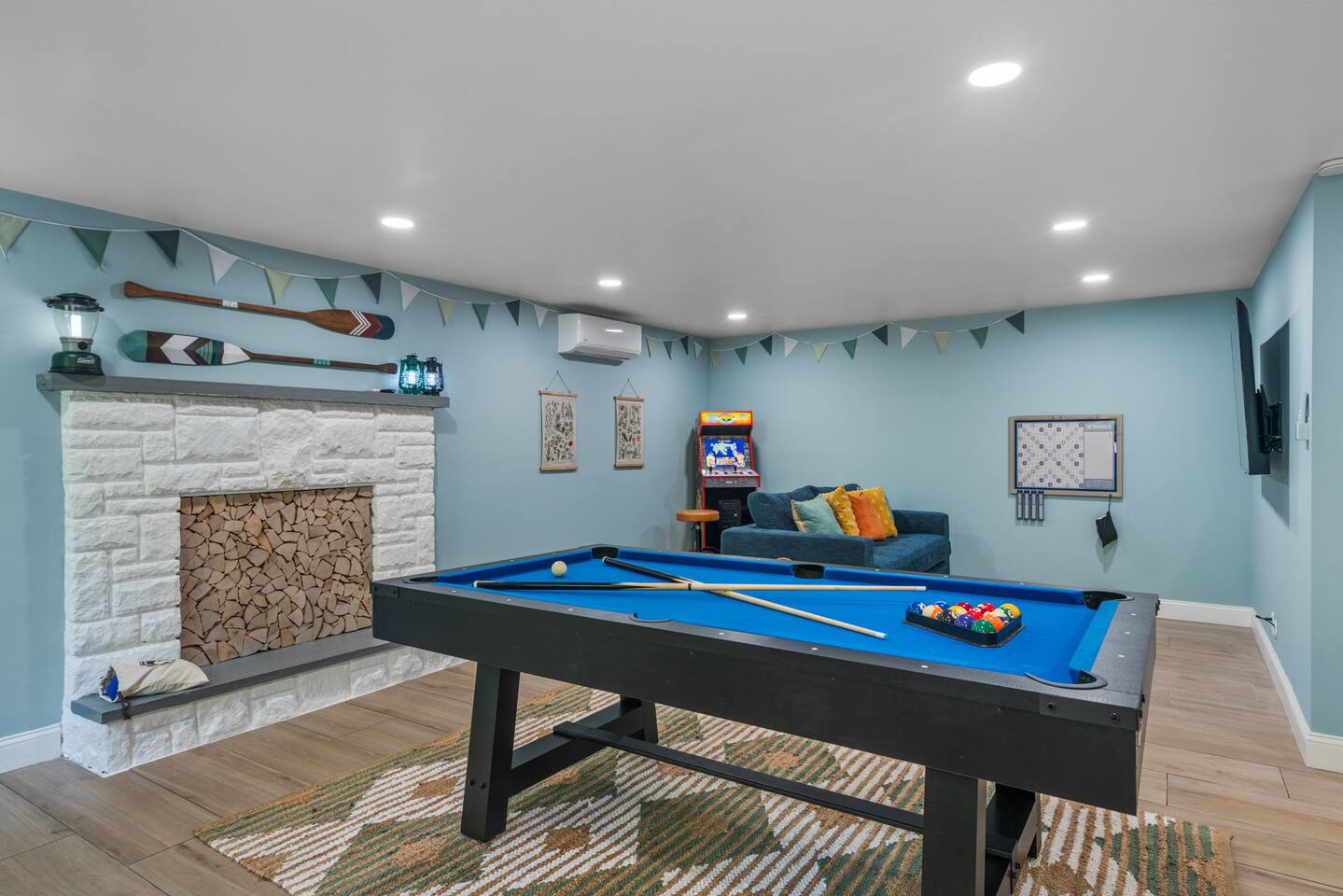 Relax, recharge & play in this cozy 4 Bedroom, 3 Bath getaway! 🔥 Fireplace & outdoor fire pit 🛁 Private hot tub & deck 🎮 Game room w/ pool table & arcade 💻 Fast Wi-Fi & workspace 🍽️ Full kitchen & dining area 🛏️ King & queen beds 🎿 Near skiing, hiking, Kalahari, Camelback & Mount Airy Casino Perfect for families, groups & long stays. Book your Poconos escape today.