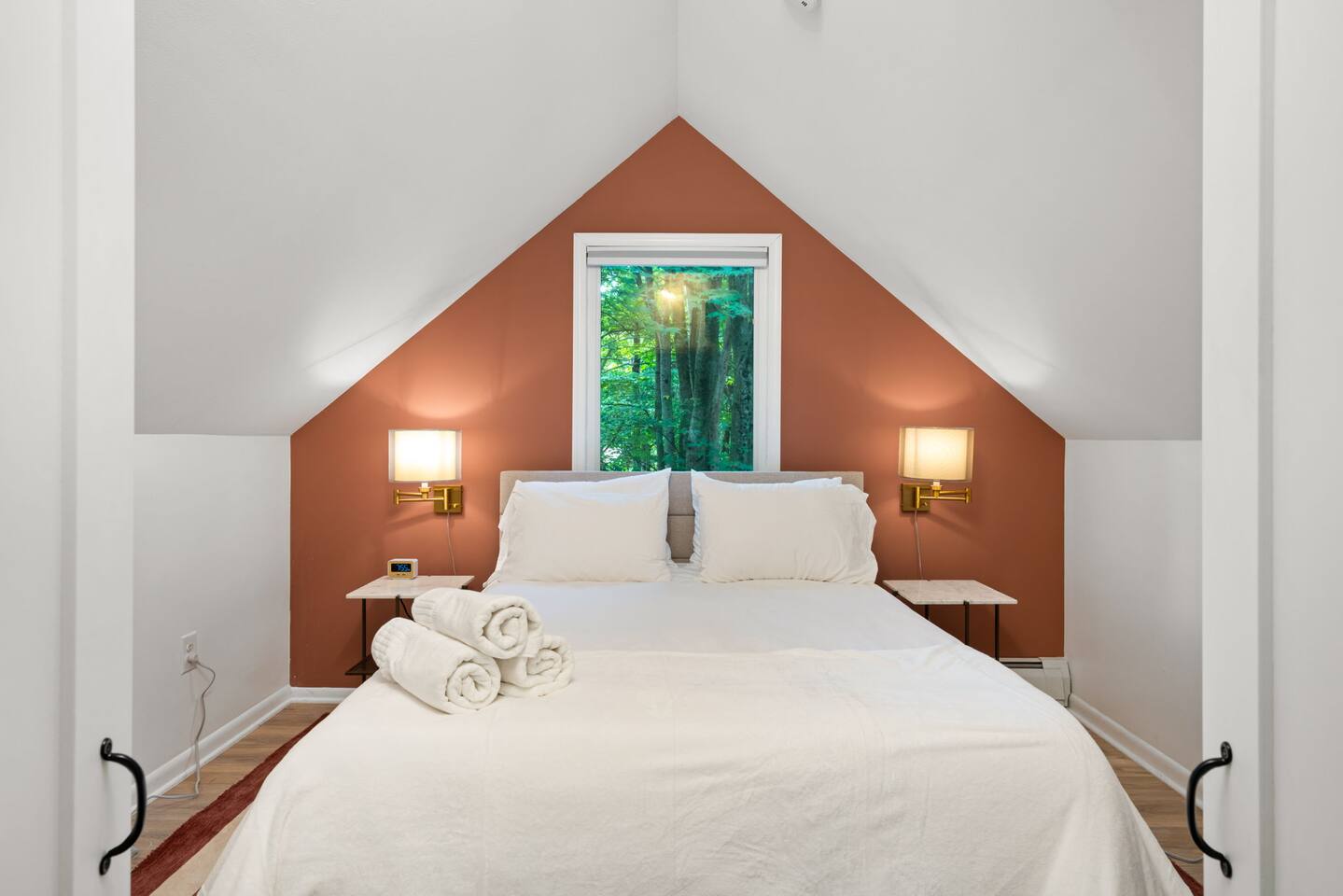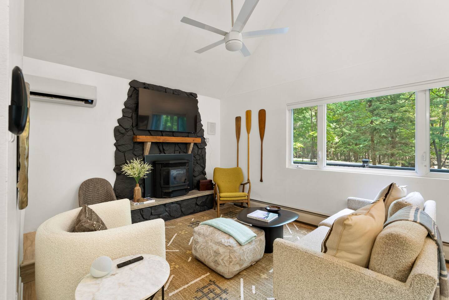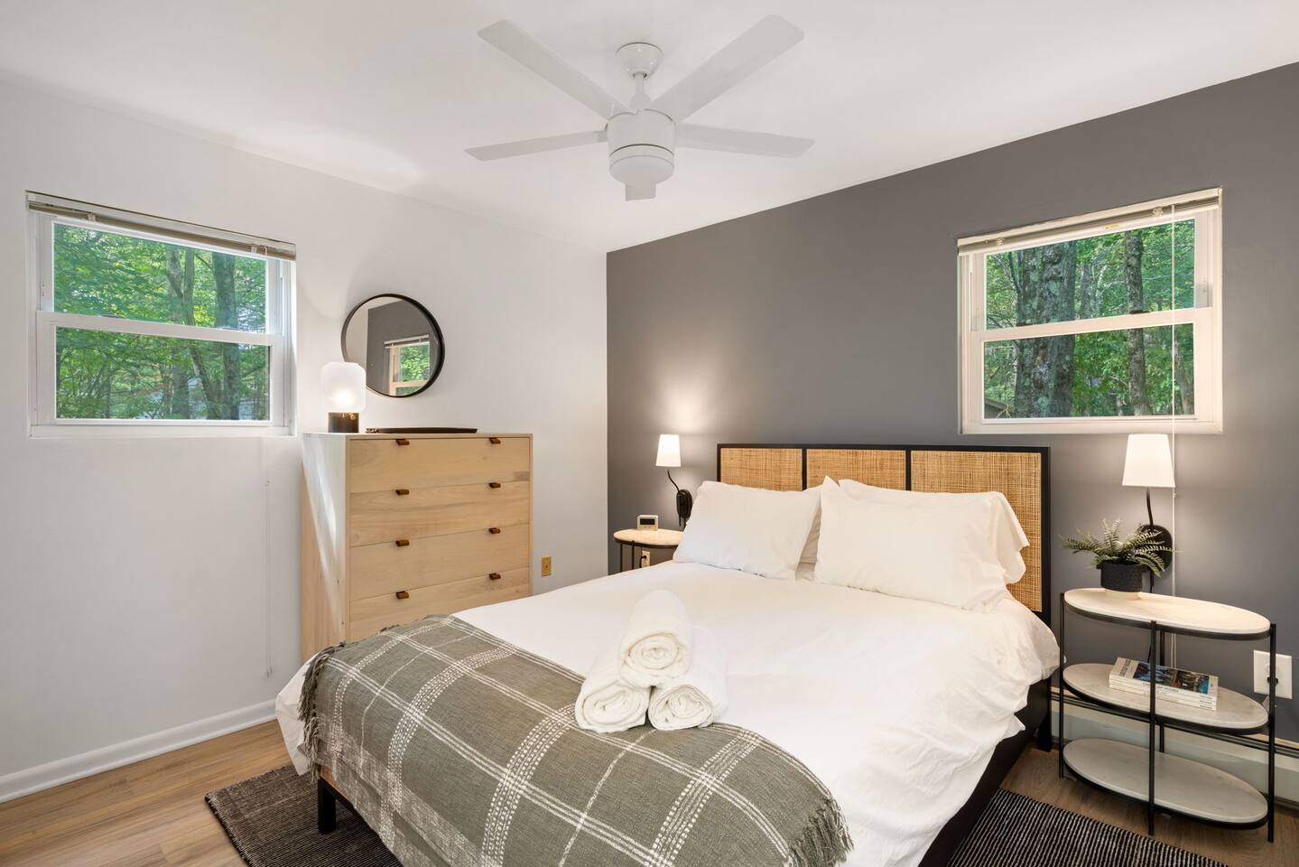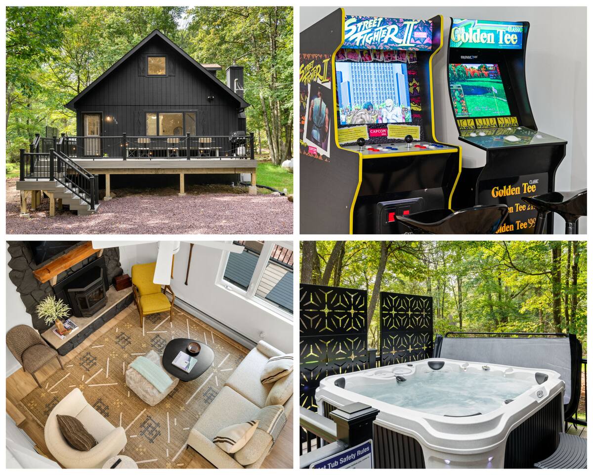 KEY FEATURES ☀ 3 beautifully styled bedrooms; each with premium queen mattresses + plush linens ☀ 2 full bathrooms with high-end finishes + essential toiletries provided ☀ Expansive wraparound deck with hot tub + forest views ☀ Cozy living area with decorative wood-burning stove + Smart TV ☀ Fully equipped kitchen with stainless steel appliances + dining for 7 ☀ Family-friendly game room with ping pong table + arcade machines ☀ Loft bedroom perfect for kids or the young at heart ☀ Free Wi-Fi, laundry area, + onsite parking for 4 vehicles BEDROOMS Designed for comfort and relaxation, each of the three bedrooms offers a cozy retreat after a day exploring the Poconos. All rooms feature queen beds with premium mattresses, soft linens, and calming natural hues that bring the serenity of the forest indoors. The loft bedroom is a guest favorite — a charming hideaway ideal for kids or a cozy reading nook. BATHROOMS The two full bathrooms are thoughtfully designed and stocked with essential toiletries, fluffy towels, and everything you’ll need to refresh after a day outdoors. One bathroom includes a shower-tub combo, while the other offers a walk-in shower for added convenience. KITCHEN & LOUNGE The heart of the cabin, our open-concept living area invites connection and comfort. Gather around the decorative wood-burning stove or settle into the plush seating for movie nights on the Smart TV. The fully equipped kitchen features new stainless-steel appliances, a drip coffee maker, toaster, and all the cookware and dinnerware needed for everyday meals. We also provide a selection of basic kitchen essentials to help get you started. Guests are welcome to bring any specialty items or ingredients they’d like to enjoy during their stay. The adjacent dining area seats four at the table plus three at the peninsula — perfect for family meals or casual breakfasts before heading out to explore the Poconos GAME ROOM Downstairs, you’ll find the ultimate entertainment space with a ping pong table, arcade machines, and a variety of classic board games — designed for guests of all ages to enjoy. OUTSIDE SPACE Step onto the expansive wraparound deck and soak in the beauty of the Poconos. Unwind in the private hot tub, fire up the grill, or gather around the fire pit for s’mores under the stars. The home also features outdoor seating and yard games, making it a perfect spot to relax or reconnect with loved ones. LOCATION Nestled just minutes from Lake Harmony, Big Boulder Ski Resort, and countless hiking and biking trails, this cabin offers the perfect balance of adventure and tranquility. Whether you’re here for skiing, boating, or simply unwinding in nature, the Midnight Mountain Cabin delivers an unforgettable stay. Book your stay at Midnight Mountain Cabin — where design meets nature and memories are made.
