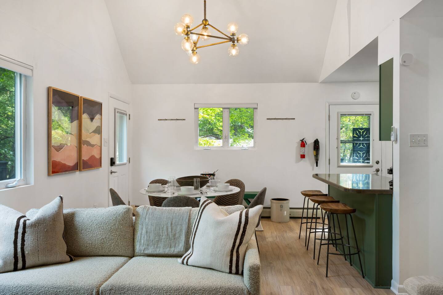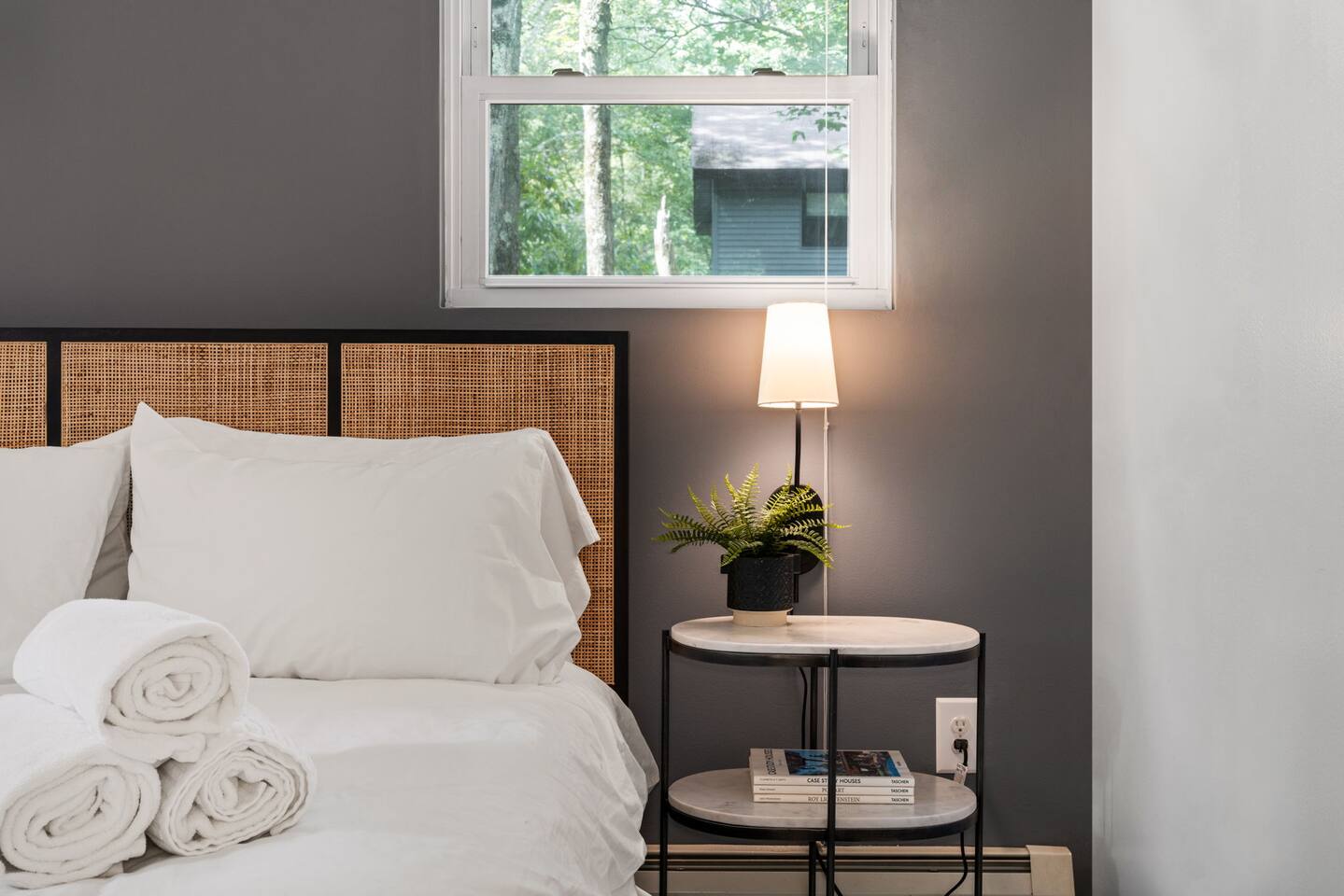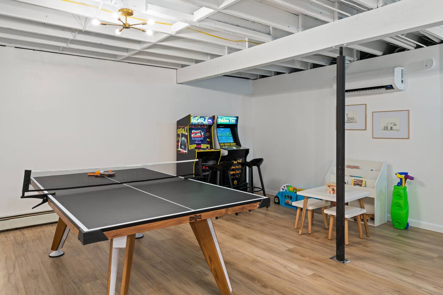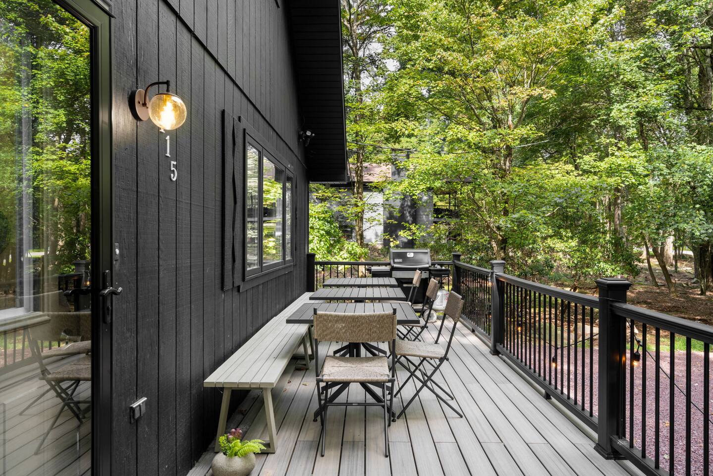 KEY FEATURES ☀ 3 beautifully styled bedrooms; each with premium queen mattresses + plush linens ☀ 2 full bathrooms with high-end finishes + essential toiletries provided ☀ Expansive wraparound deck with hot tub + forest views ☀ Cozy living area with decorative wood-burning stove + Smart TV ☀ Fully equipped kitchen with stainless steel appliances + dining for 7 ☀ Family-friendly game room with ping pong table + arcade machines ☀ Loft bedroom perfect for kids or the young at heart ☀ Free Wi-Fi, laundry area, + onsite parking for 4 vehicles BEDROOMS Designed for comfort and relaxation, each of the three bedrooms offers a cozy retreat after a day exploring the Poconos. All rooms feature queen beds with premium mattresses, soft linens, and calming natural hues that bring the serenity of the forest indoors. The loft bedroom is a guest favorite — a charming hideaway ideal for kids or a cozy reading nook. BATHROOMS The two full bathrooms are thoughtfully designed and stocked with essential toiletries, fluffy towels, and everything you’ll need to refresh after a day outdoors. One bathroom includes a shower-tub combo, while the other offers a walk-in shower for added convenience. KITCHEN & LOUNGE The heart of the cabin, our open-concept living area invites connection and comfort. Gather around the decorative wood-burning stove or settle into the plush seating for movie nights on the Smart TV. The fully equipped kitchen features new stainless-steel appliances, a drip coffee maker, toaster, and all the cookware and dinnerware needed for everyday meals. We also provide a selection of basic kitchen essentials to help get you started. Guests are welcome to bring any specialty items or ingredients they’d like to enjoy during their stay. The adjacent dining area seats four at the table plus three at the peninsula — perfect for family meals or casual breakfasts before heading out to explore the Poconos GAME ROOM Downstairs, you’ll find the ultimate entertainment space with a ping pong table, arcade machines, and a variety of classic board games — designed for guests of all ages to enjoy. OUTSIDE SPACE Step onto the expansive wraparound deck and soak in the beauty of the Poconos. Unwind in the private hot tub, fire up the grill, or gather around the fire pit for s’mores under the stars. The home also features outdoor seating and yard games, making it a perfect spot to relax or reconnect with loved ones. LOCATION Nestled just minutes from Lake Harmony, Big Boulder Ski Resort, and countless hiking and biking trails, this cabin offers the perfect balance of adventure and tranquility. Whether you’re here for skiing, boating, or simply unwinding in nature, the Midnight Mountain Cabin delivers an unforgettable stay. Book your stay at Midnight Mountain Cabin — where design meets nature and memories are made.