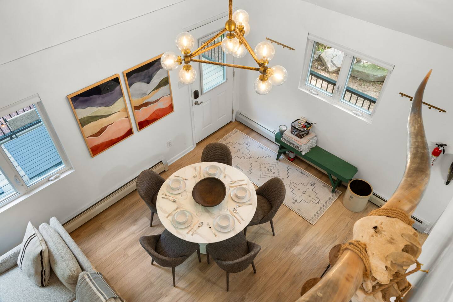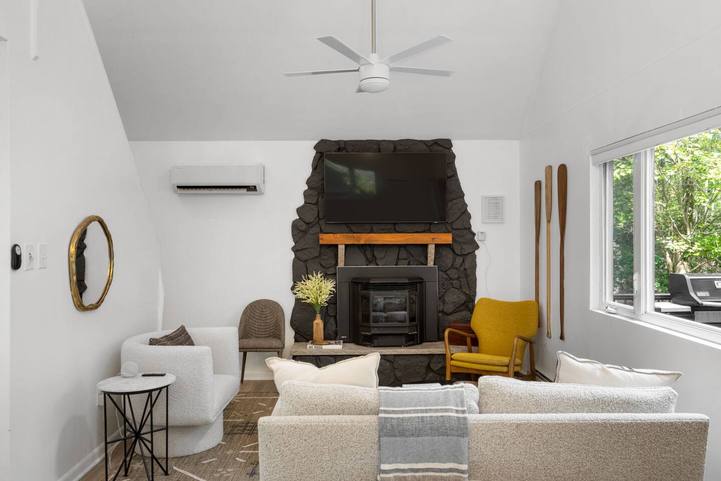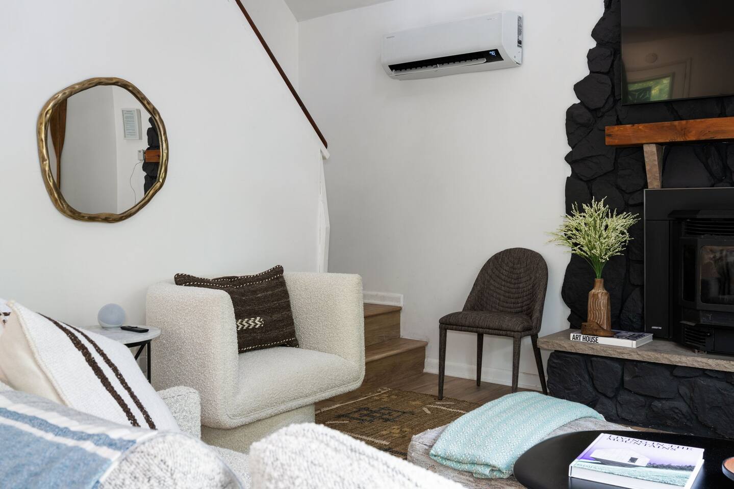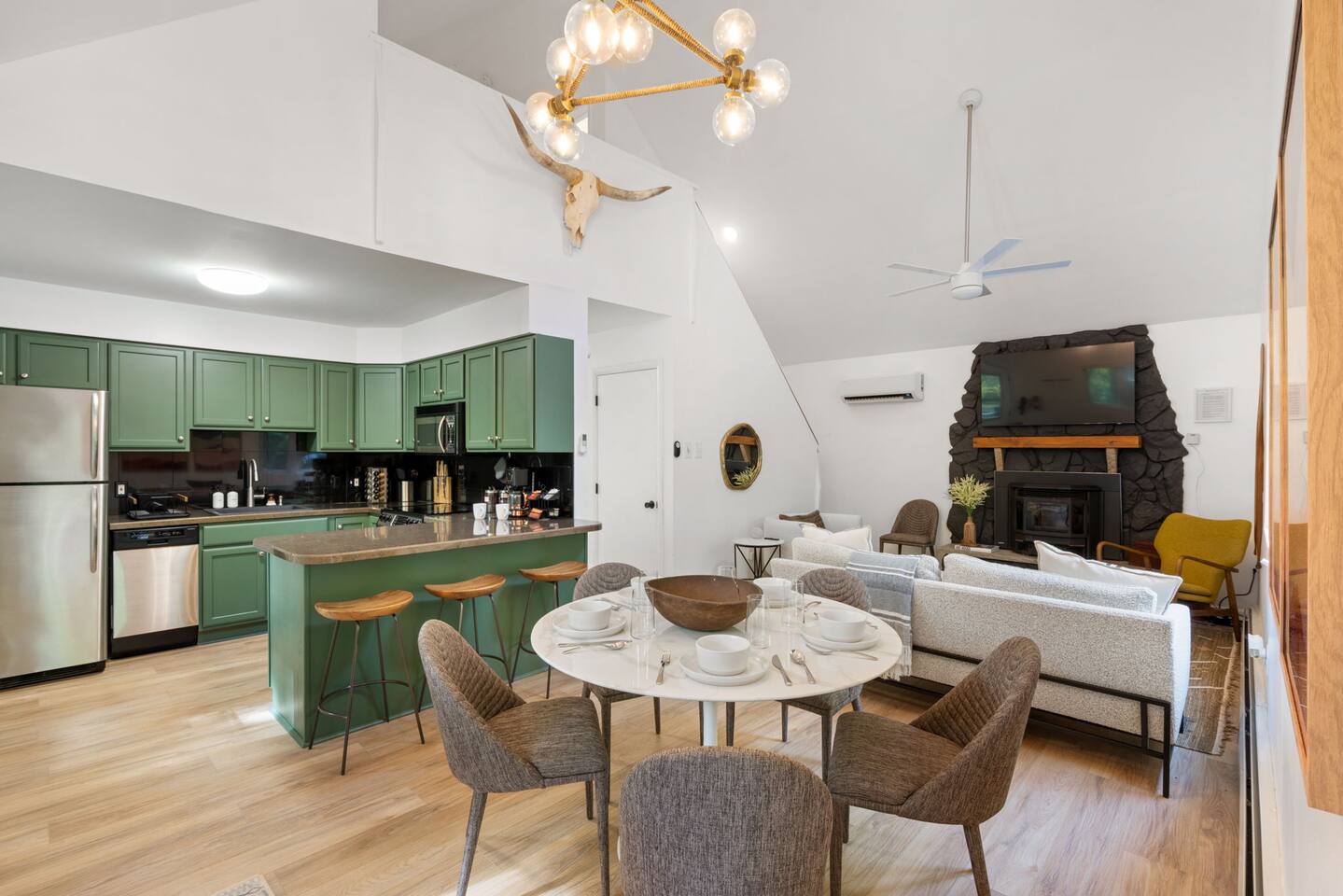 KEY FEATURES ☀ 3 beautifully styled bedrooms; each with premium queen mattresses + plush linens ☀ 2 full bathrooms with high-end finishes + essential toiletries provided ☀ Expansive wraparound deck with hot tub + forest views ☀ Cozy living area with decorative wood-burning stove + Smart TV ☀ Fully equipped kitchen with stainless steel appliances + dining for 7 ☀ Family-friendly game room with ping pong table + arcade machines ☀ Loft bedroom perfect for kids or the young at heart ☀ Free Wi-Fi, laundry area, + onsite parking for 4 vehicles BEDROOMS Designed for comfort and relaxation, each of the three bedrooms offers a cozy retreat after a day exploring the Poconos. All rooms feature queen beds with premium mattresses, soft linens, and calming natural hues that bring the serenity of the forest indoors. The loft bedroom is a guest favorite — a charming hideaway ideal for kids or a cozy reading nook. BATHROOMS The two full bathrooms are thoughtfully designed and stocked with essential toiletries, fluffy towels, and everything you’ll need to refresh after a day outdoors. One bathroom includes a shower-tub combo, while the other offers a walk-in shower for added convenience. KITCHEN & LOUNGE The heart of the cabin, our open-concept living area invites connection and comfort. Gather around the decorative wood-burning stove or settle into the plush seating for movie nights on the Smart TV. The fully equipped kitchen features new stainless-steel appliances, a drip coffee maker, toaster, and all the cookware and dinnerware needed for everyday meals. We also provide a selection of basic kitchen essentials to help get you started. Guests are welcome to bring any specialty items or ingredients they’d like to enjoy during their stay. The adjacent dining area seats four at the table plus three at the peninsula — perfect for family meals or casual breakfasts before heading out to explore the Poconos GAME ROOM Downstairs, you’ll find the ultimate entertainment space with a ping pong table, arcade machines, and a variety of classic board games — designed for guests of all ages to enjoy. OUTSIDE SPACE Step onto the expansive wraparound deck and soak in the beauty of the Poconos. Unwind in the private hot tub, fire up the grill, or gather around the fire pit for s’mores under the stars. The home also features outdoor seating and yard games, making it a perfect spot to relax or reconnect with loved ones. LOCATION Nestled just minutes from Lake Harmony, Big Boulder Ski Resort, and countless hiking and biking trails, this cabin offers the perfect balance of adventure and tranquility. Whether you’re here for skiing, boating, or simply unwinding in nature, the Midnight Mountain Cabin delivers an unforgettable stay. Book your stay at Midnight Mountain Cabin — where design meets nature and memories are made.